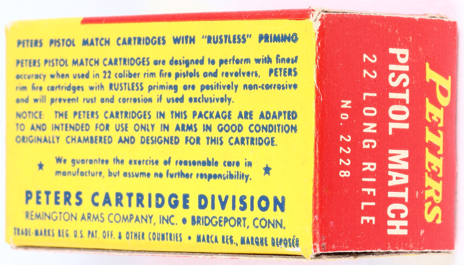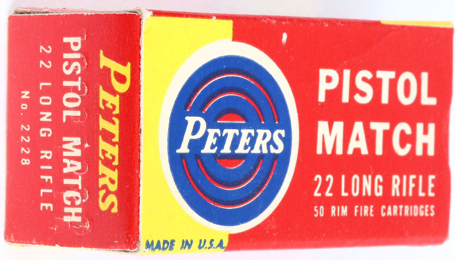 Peters, Pistol Match, .22 Long Rifle, RHWeb: PCC-55 LR-2b, Full, 1pc. Red Yellow & blue box, box is MINT with minty color, sharp corners, crisp edges, end flaps are solid, ammo is excellent. Grade: MINT - Value: 20 to 60