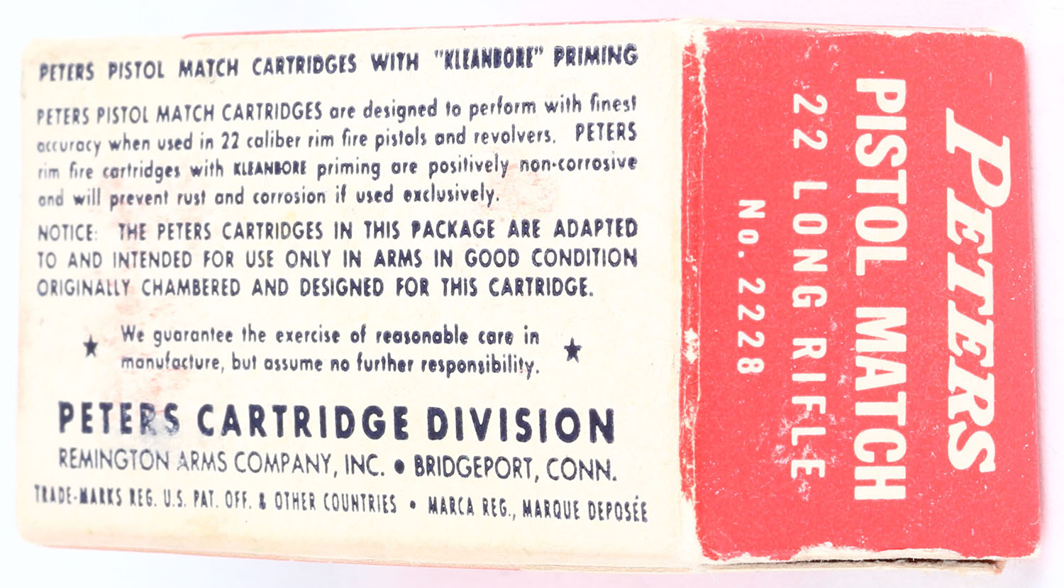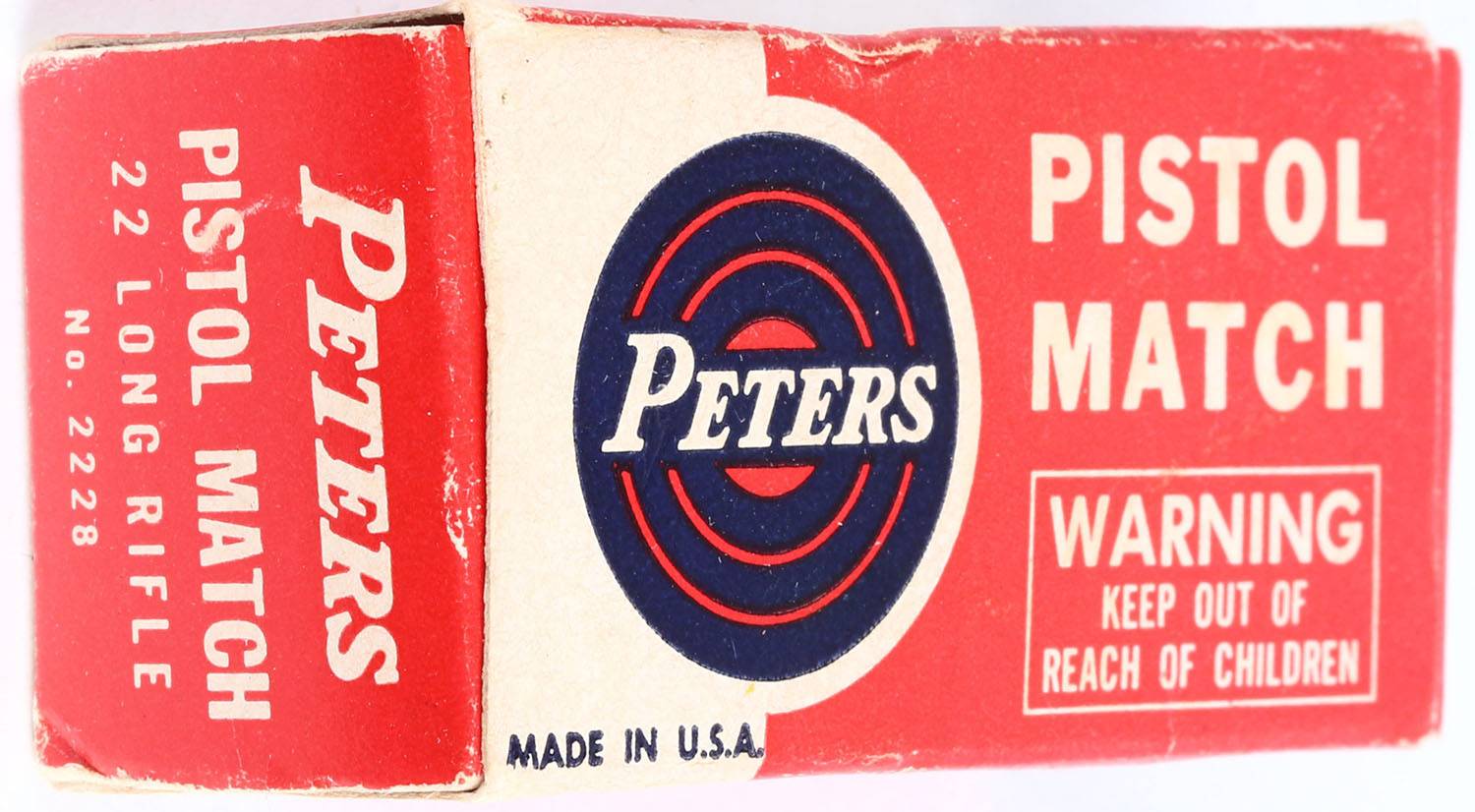 Peters, Pistol Match, .22 Long Rifle, RHWeb: PCC-55 LR-5a, Full, 1pc. Red white & blue box, box is solid with excellent color, very minor age soiling & corner wear, edges are mostly crisp, end flaps are solid, ammo is excellent. Grade: Excellent ++ - Value: 20 to 60