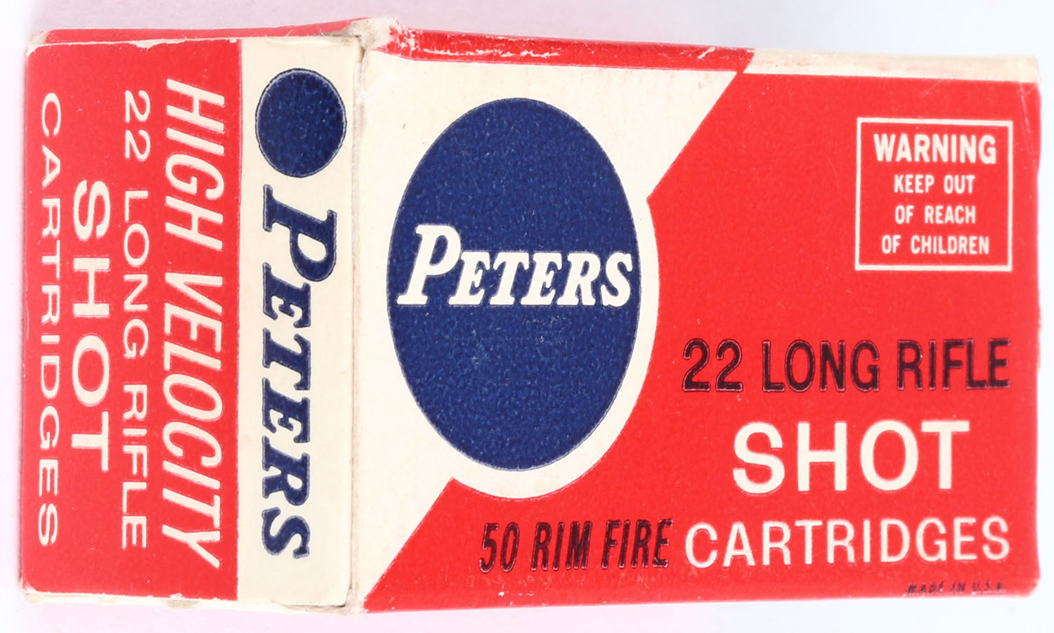 Peters, High Velocity, .22 Long Rifle Shot, RHWeb: PCC-20 LR-4b, Full, 1pc. Red white & blue box, box is solid with excellent color, very minor age soiling & corner wear, edges are crisp, end flaps are solid, ammo is excellent. Grade: Excellent + - Value: 20 to 60