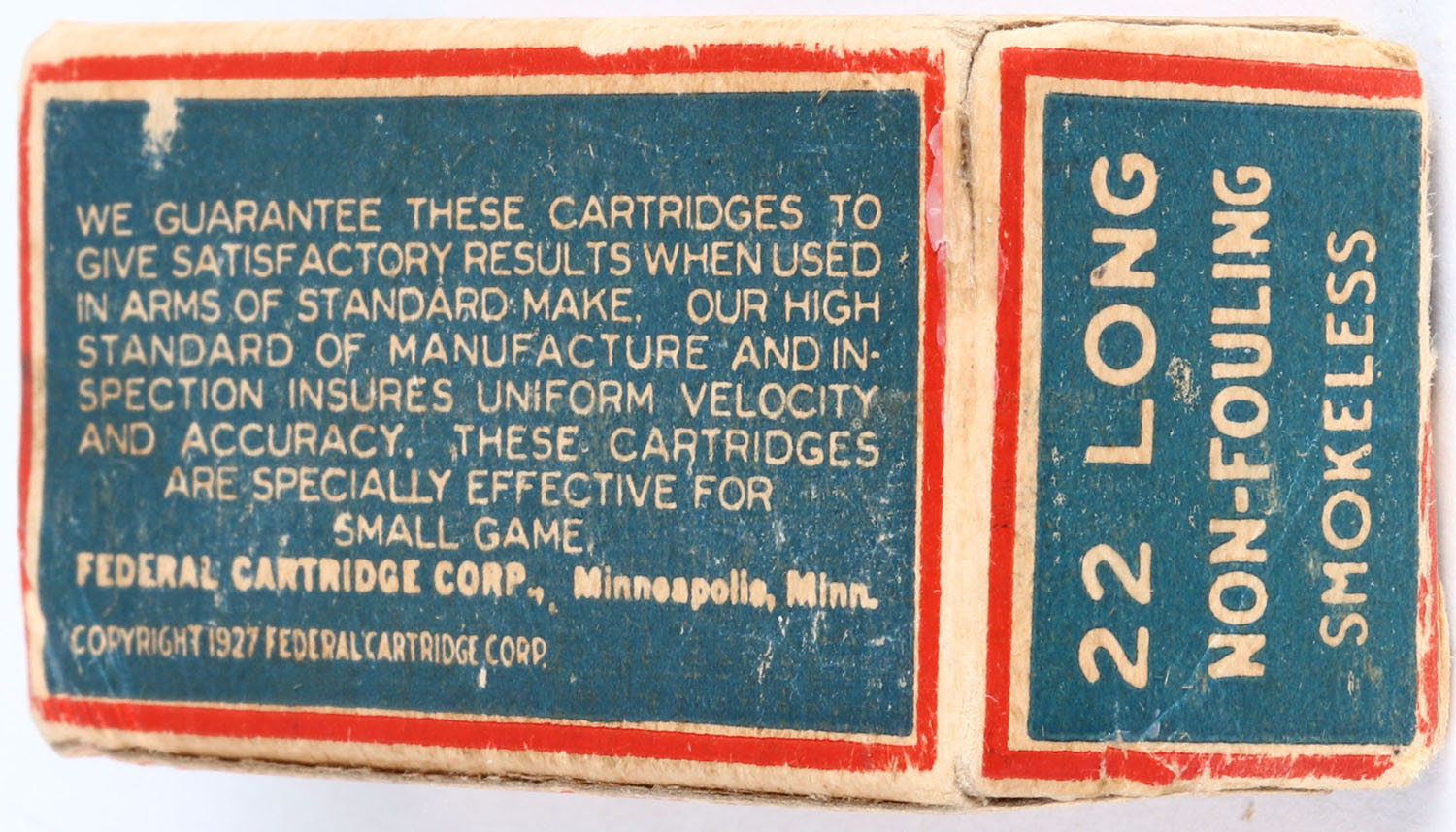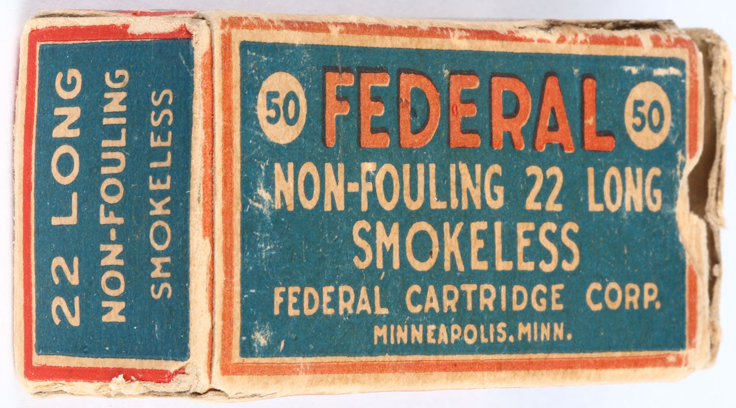 Federal, Non-Fouling Smokeless, .22 Long, RHWeb: FCC-2 L-1c, Full, 1pc. Blue red & white box, box is solid with very good color, some age soiling, partial seam split to top back edge, insert tab on right end flap is torn, age soiling, edge & corner wear, ammo is very good to excellent. Grade: Very Good ++ - Value: 50 to 250