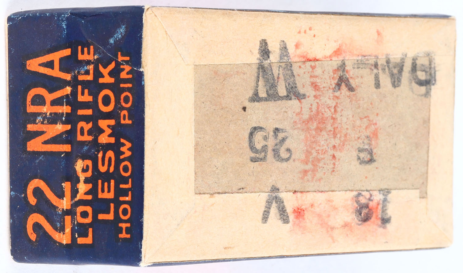 U.S., NRA, .22 Long Rifle Hollow Point, Target Issue, Lesmok, RHWeb: US-51 LR-4b, FULL & SEALED, 2pc. Blue & orange box with red over label, box is solid with excellent to minty color, only minor fading to front side of red over label, edges are crisp, corners are sharp, very minor shelf wear on top. Grade: Excellent ++ - Value: 50 to 150