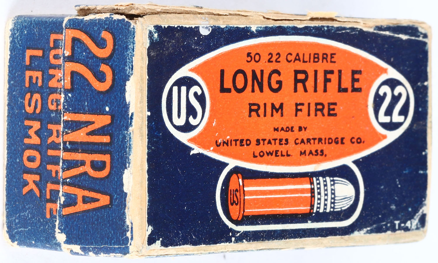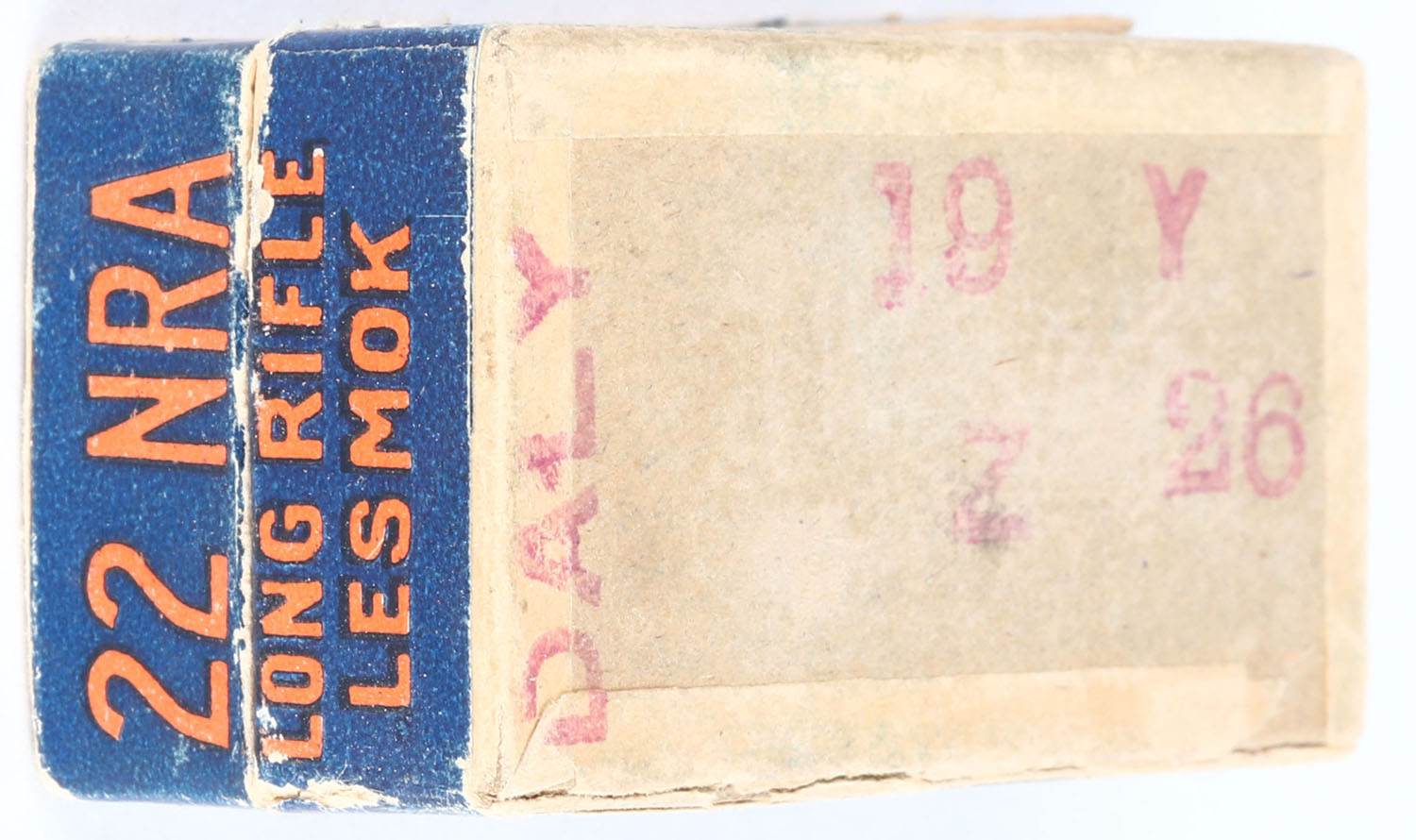U.S., 22 NRA, .22 Long Rifle Lesmok, RHWeb: US-51 LR-5, Full, 2pc. Buff box with blue orange & white top and wraparound labels, box is solid with excellent color, lid has partial seam splits that have been tape repaired, some edge & corner wear, very minor chipping to labels, ammo is very good. Grade: Very Good ++ - Value: 10 to 50