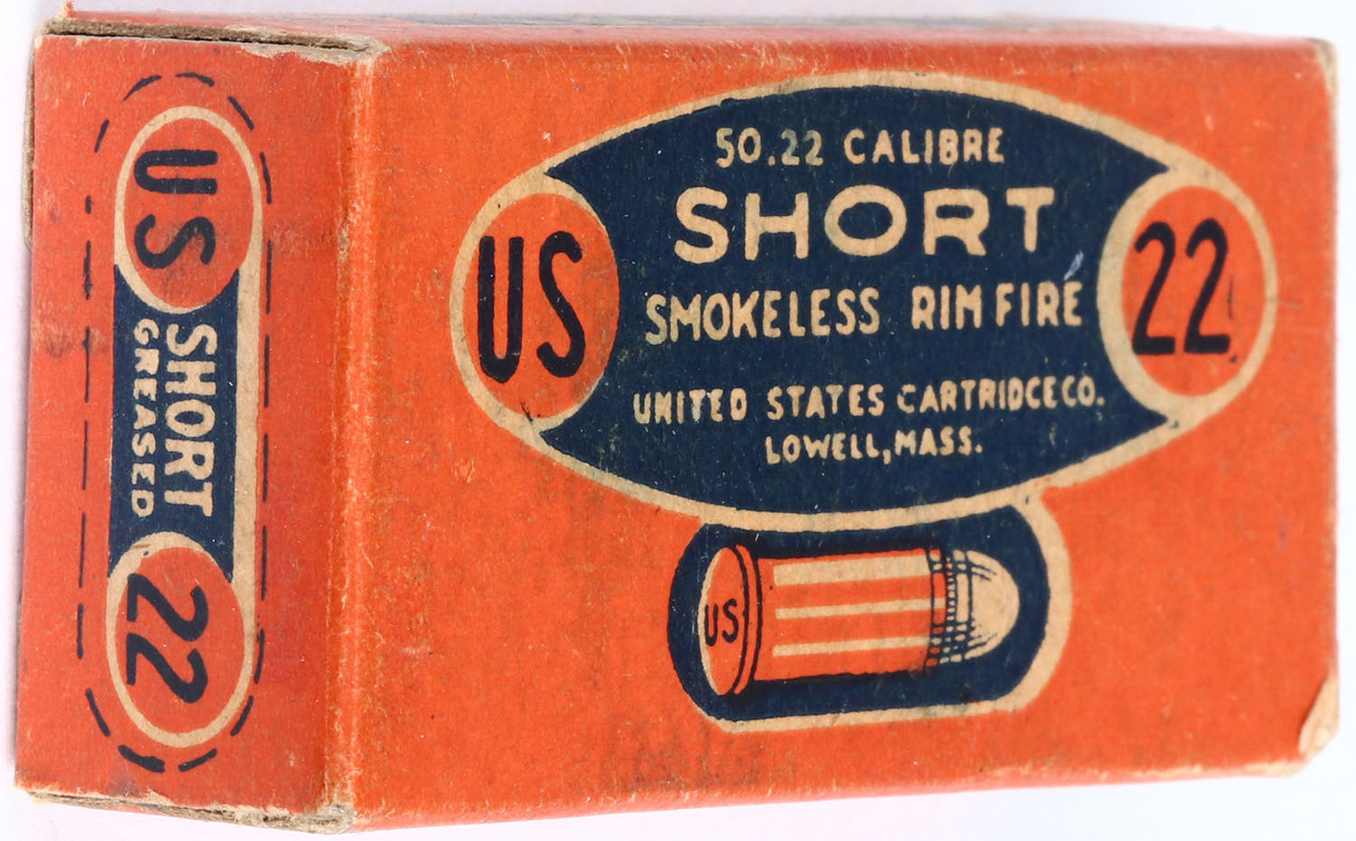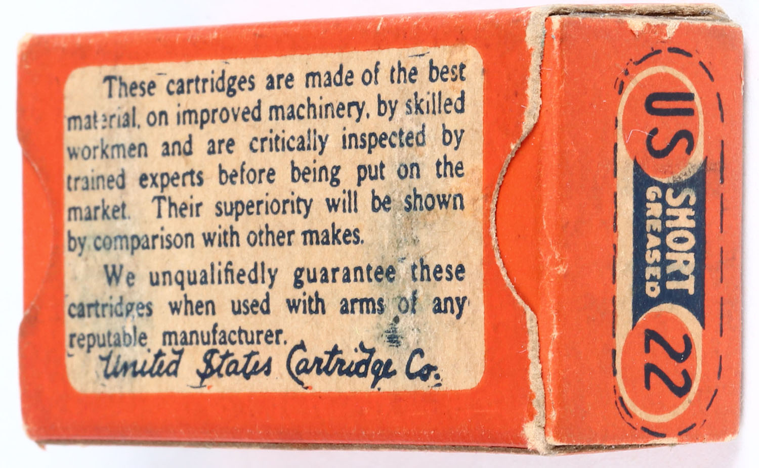 U.S., .22 Short, Smokeless Greased, RHWeb: US-8 S-4e, Full, 1pc. Orange blue & white box, box is solid with very good color, age soiling, right end flap has been torn & taped back on, some corner wear, edges are mostly crisp, left end flap is solid, ammo is very good. Grade: Very Good ++ - Value: 10 to 50