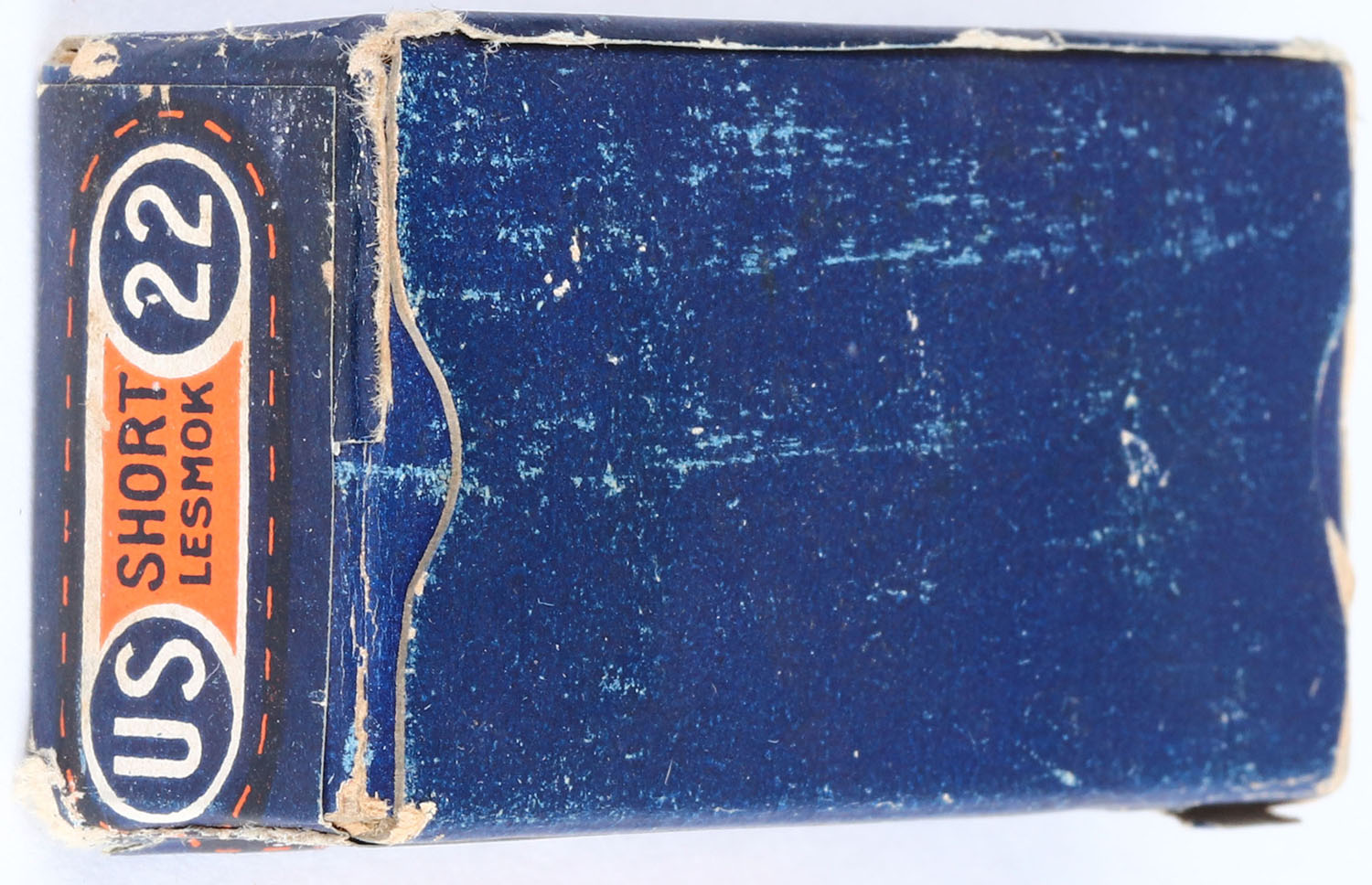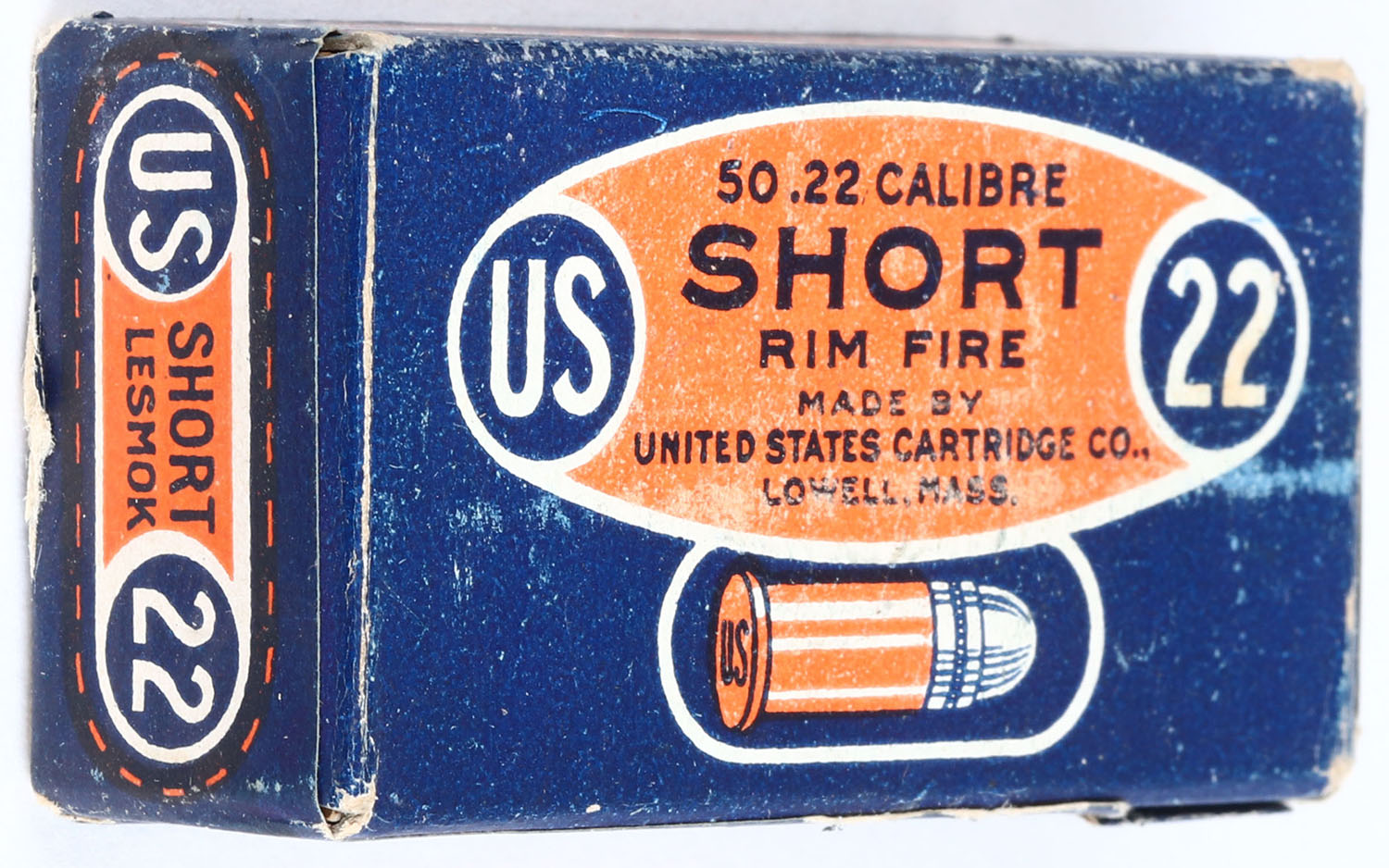 U.S., .22 Short, Lesmok, RHWeb: US-8 S-2d (only no printing on bottom), FULL & SEALED, 1pc. Blue orange & white box with side sealing label, box is solid with excellent color, some shelf & corner wear, very minor edge wear, label is intact with a small tear to the front side. Grade: Excellent + - Value: 20 to 80