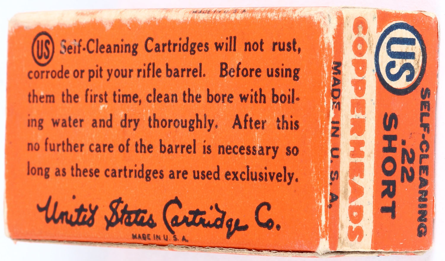 U.S., Copperheads, .22 Short, Self-Cleaning, RHWeb: US-12 S-1b, Full, 1pc. Orange white & blue box, box is solid with excellent color, very minor age soiling & corner wear, edges are mostly crisp, end flaps are solid, ammo is very good to excellent. Grade: Excellent + - Value: 30 to 90