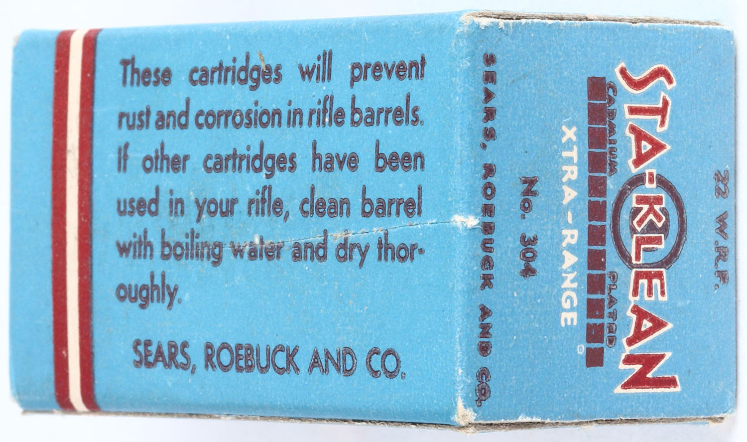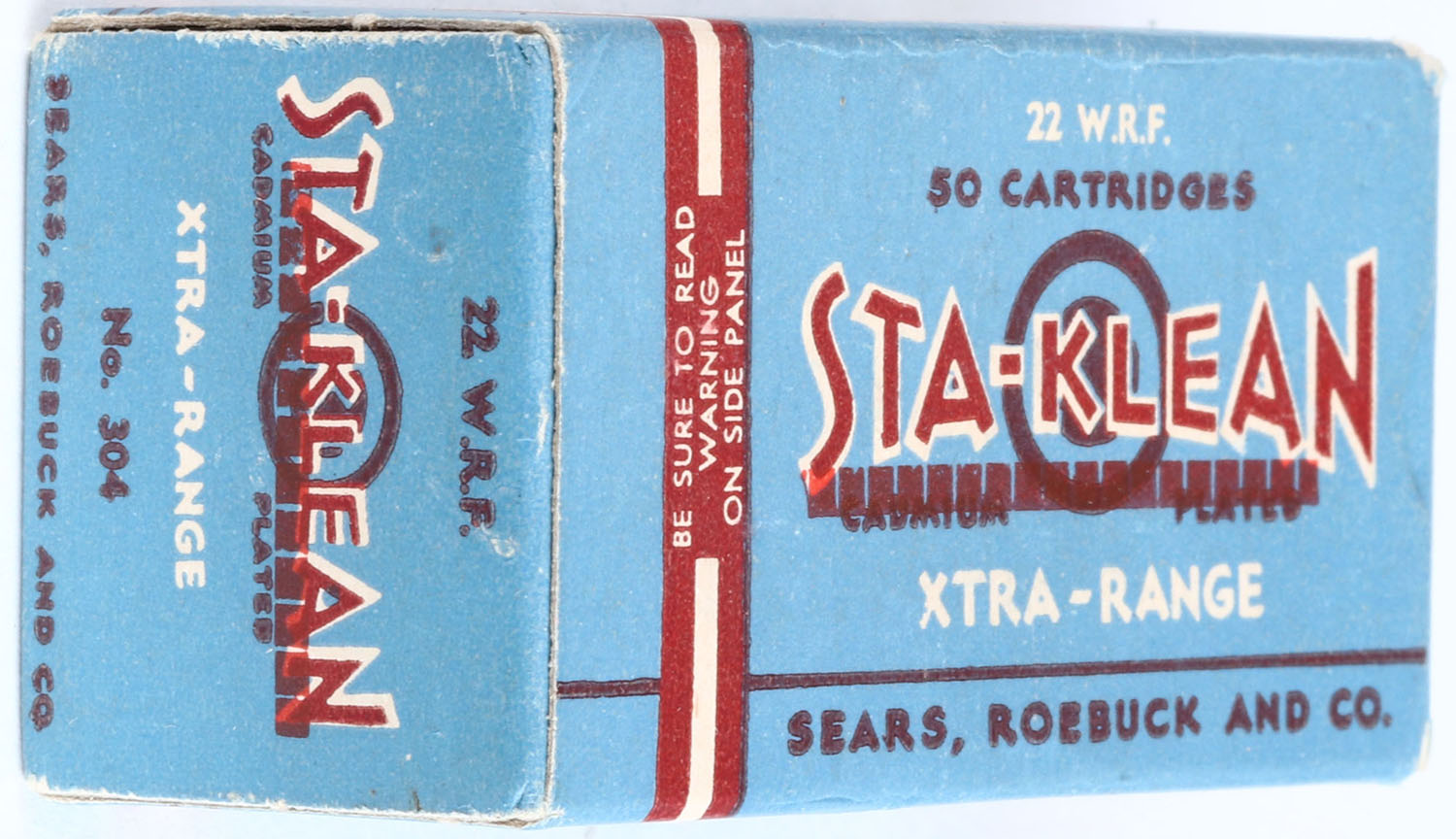 Sears, Sta-Klean, .22 W.R.F., Xtra-Range, RHWeb: SEARS-4 WRF-2, Full, 1pc. Blue maroon & white box, box is solid with excellent color, minor corner wear, edges are mostly crisp, end flaps are solid, ammo is excellent. Grade: Excellent ++ - Value: 30 to 60