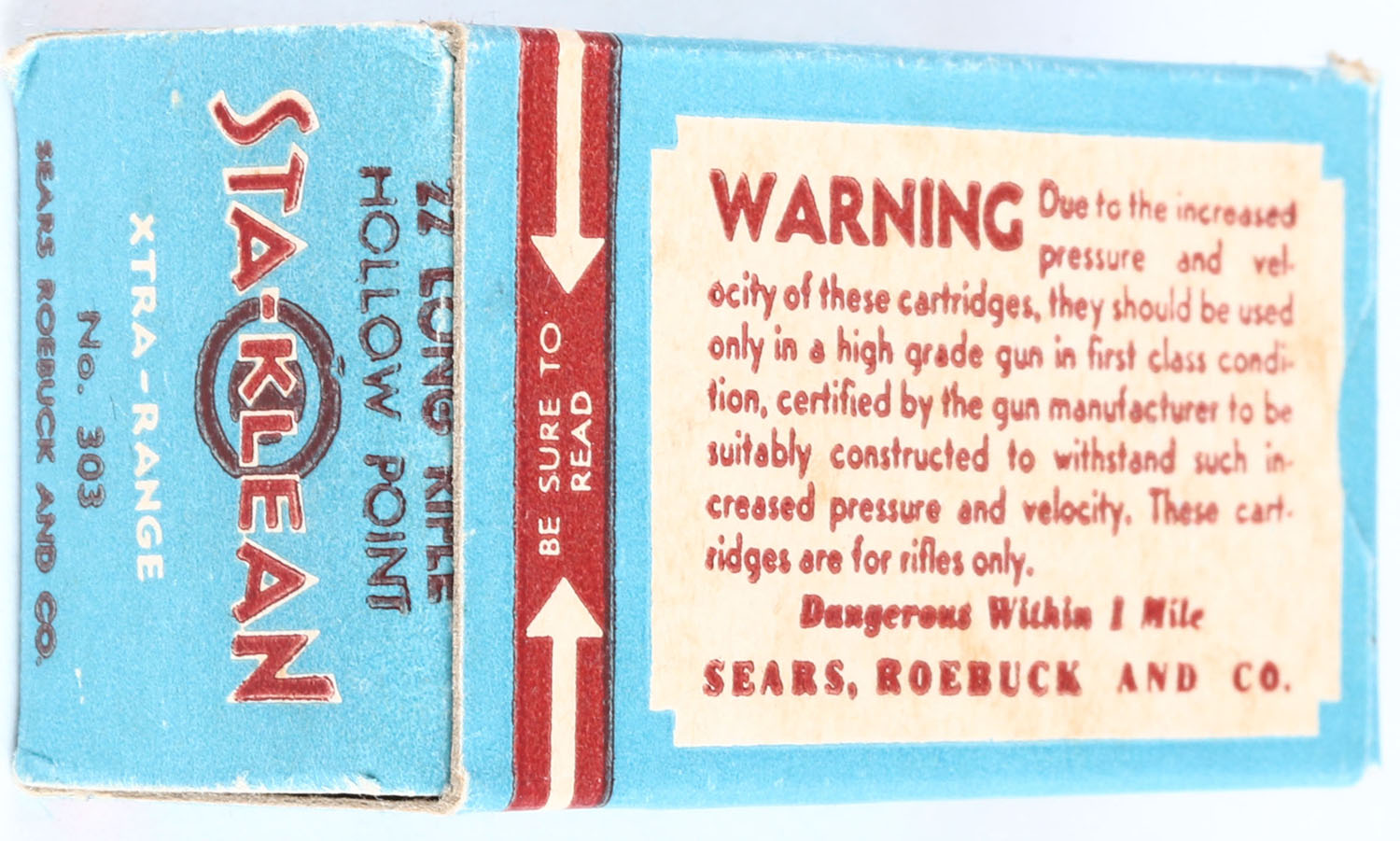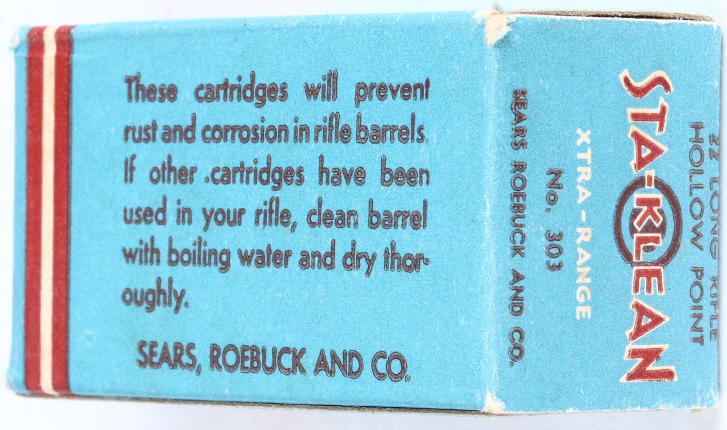 Sears, Sta-Klean, .22 Long Rifle Hollow Point, Xtra-Range, RHWeb: SEARS-6 LR-9, Full, 1pc. Blue white & burgundy box, box is near mint with excellent color, very minor age soiling & corner wear, edges are crisp, end flaps are solid, ammo is minty. Grade: Excellent ++ - Value: 20 to 60