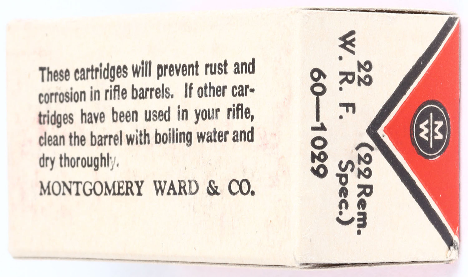 Ward's, CleanFire EP, .22 W.R.F. (.22 Rem. Spec.), RHWeb: MW-3D WRF-4b, Full, 1pc. Red white & black box, box is very near mint with excellent to minty color, only very minor age soiling on bottom and only very slight corner wear on one corner, corners are otherwise sharp, edges are crisp, end flaps are solid, ammo is excellent. Grade: Excellent ++ - Value: 40 to 200
