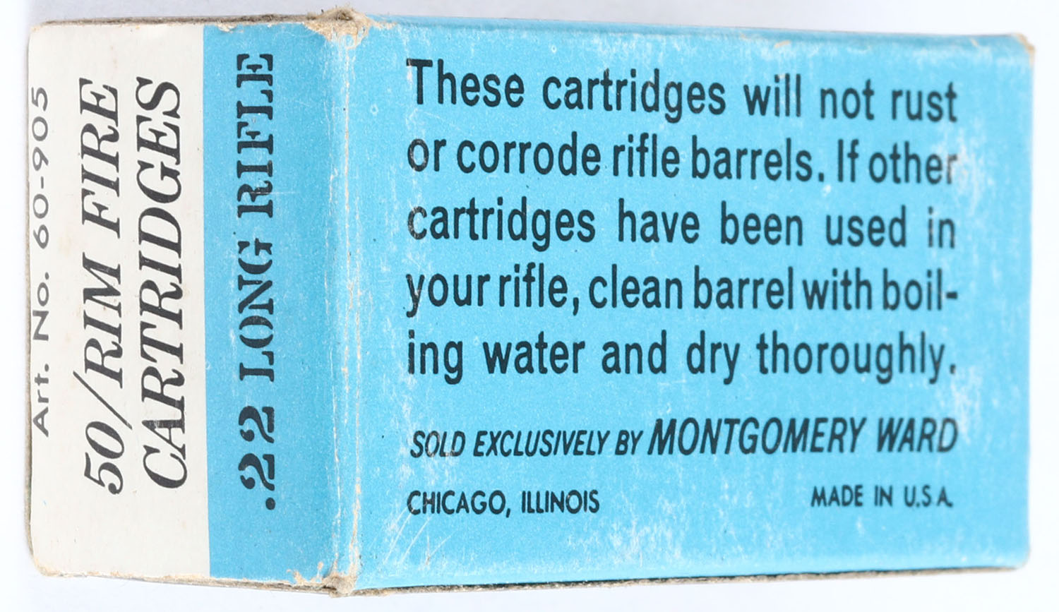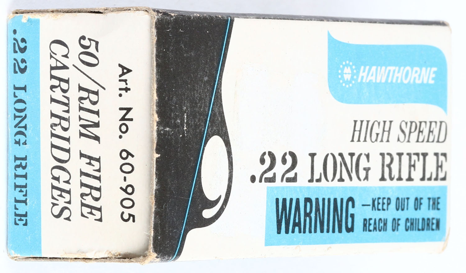 Wards, Hawthorne, .22 Long Rifle, High Speed, RHWeb: MW-7 LR-1a, Full, 1pc. White black & blue box, box is solid with excellent color, minor age soiling & corner wear, edges are mostly crisp, end flaps are solid, ammo is very good to excellent. Grade: Excellent + - Value: 4 to 20