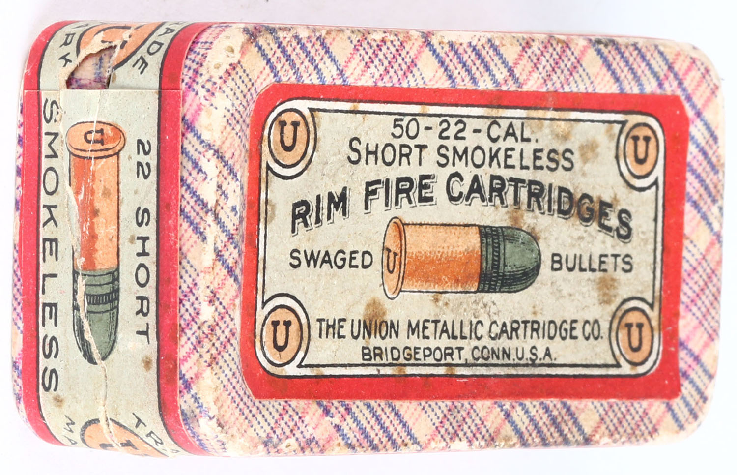 UMC, Gallery Practice, .22 Short, Smokeless, Swaged Bullets, RHWeb: UMC-10 S-1b, Full, 1pc. Purple fabric box with green & red top & side sealing labels, salmon colored bottom label, box is solid with excellent color, only very minor age soiling , minor edge wear, minor shelf wear to bottom, bottom label has been written on, label is 99% intact, ammo is very good. Grade: Excellent + - Value: 50 to 150
