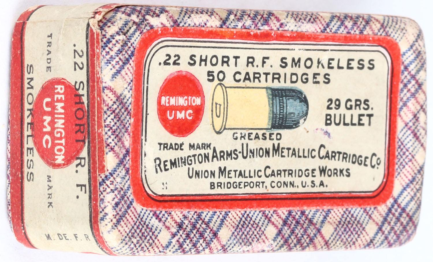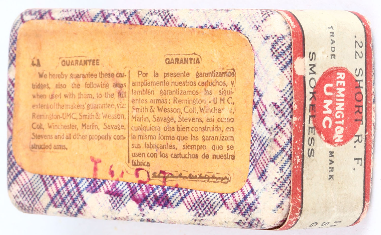 REM-UMC, .22 Short, Smokeless, RHWeb: REM-2 S4a, FULL & SEALED, 2pc. Purple fabric box with gray & red top & side sealing labels, orange bottom label, box is solid with excellent color, very minor edge wear, some shelf wear to bottom and sides, labels are intact. Grade: Excellent ++ - Value: 50 to 150