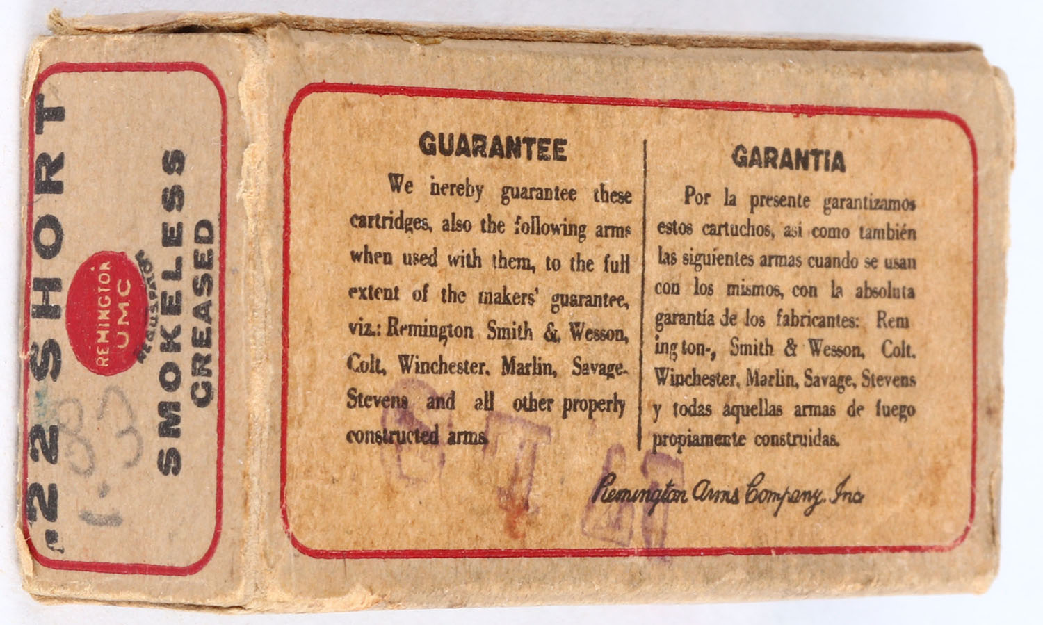 REM-UMC, .22 Short, Smokeless Greased, RHWeb: REM-5 S-4B, Full, 1pc. Buff red & gray box, box is solid with very good to excellent color, some age soiling, minor edge & corner wear, partial seam split to top back edge, end flaps are solid, ammo is very good. Grade: Excellent - Value: 40 to 120