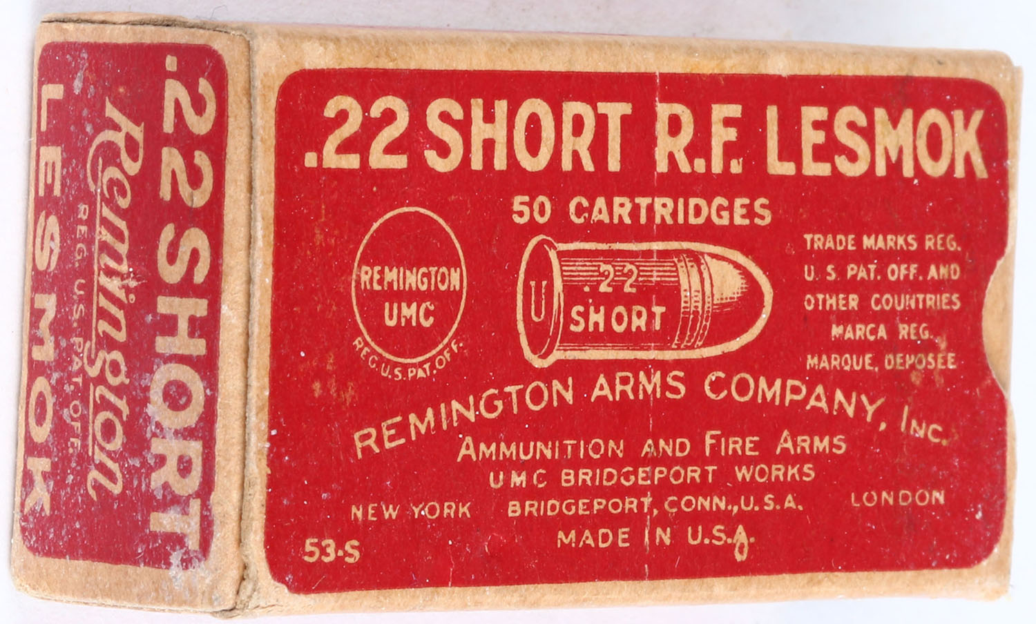 REM-UMC, .22 Short, Lesmok, RHWeb: REM-6 S-2.1A, Full, 1pc. Red & buff box, box is solid with excellent color, very minor age soiling & corner wear, edges are crisp, end flaps are solid, ammo is good to very good. Grade: Excellent + - Value: 20 to 60