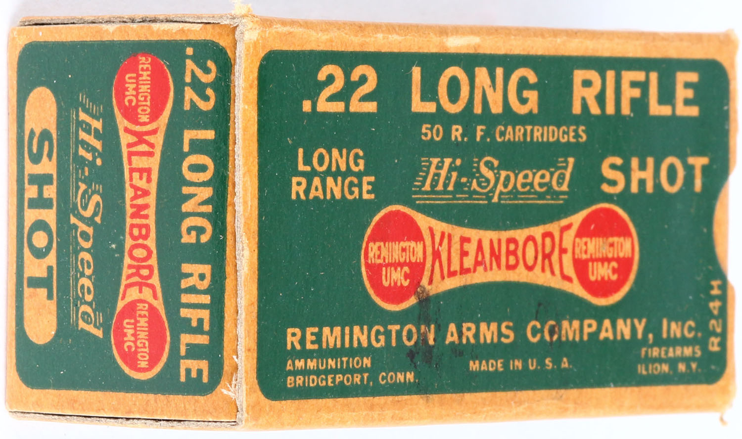 Remington, Hi-Speed Kleanbore, .22 Long Rifle Shot, RHWeb: REM-7.4 LR-4c, Full, 1pc. Green & buff dog bone box, box is solid with excellent color, very small stain on top, corners are mostly sharp, edges are crisp, end flaps are solid, ammo is excellent. Grade: Excellent ++ - Value: 20 to 60