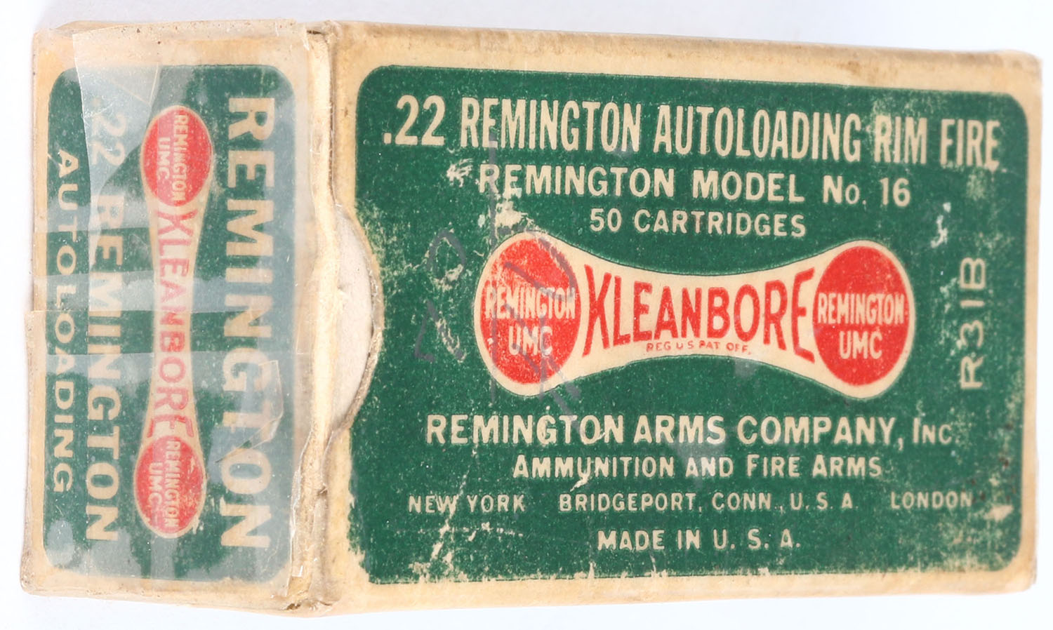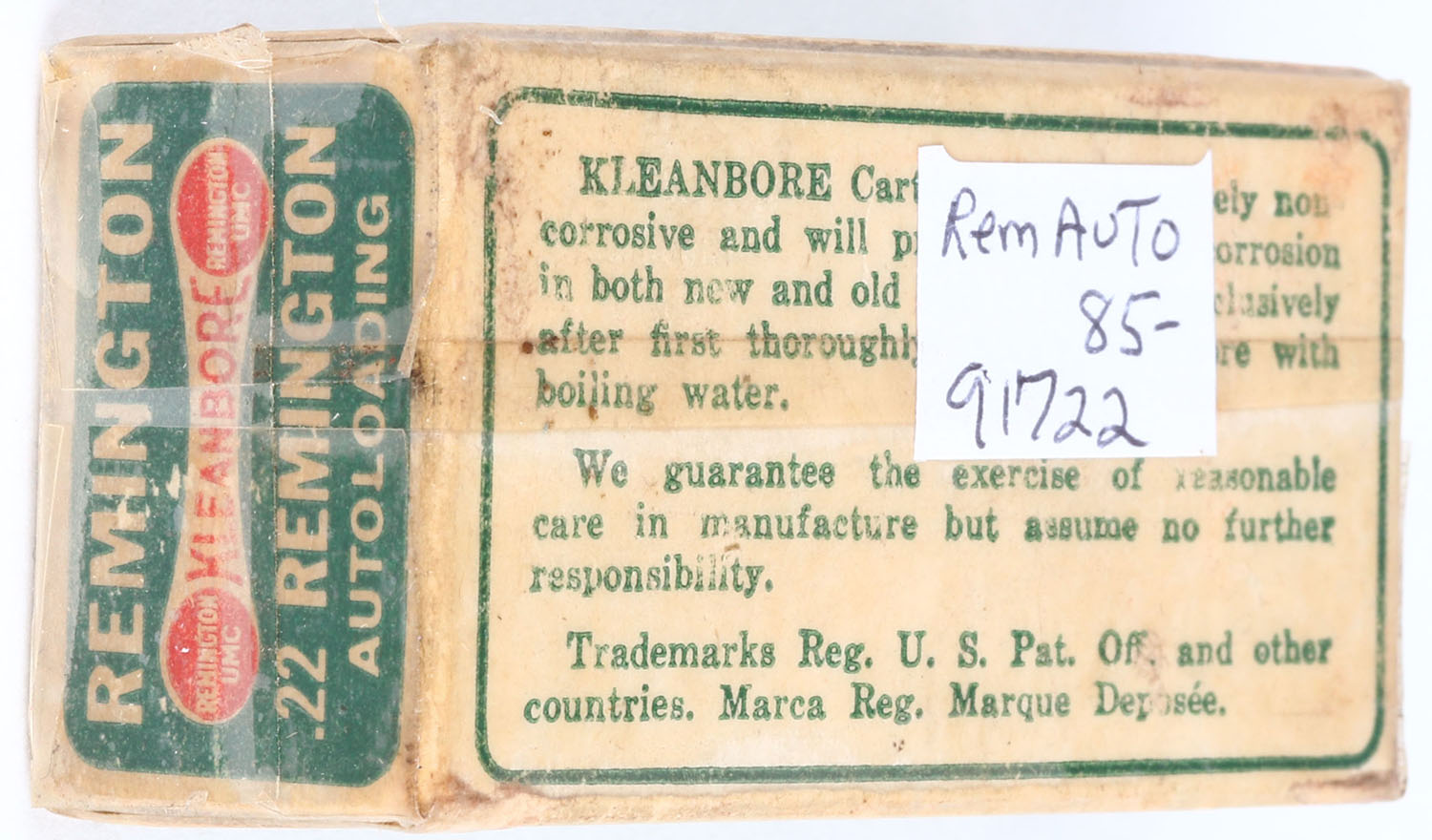 Remington, Kleanbore, .22 Remington Autoloading, RHWeb: REM-7.1B RA-1e, Full, 1pc. Green white & red dog bone box, box is solid with excellent color, the entire box is covered in tape, minor age soiling, very minor edge & corner wear, end flaps are solid, ammo is excellent. Grade: Very Good + - Value: 10 to 50