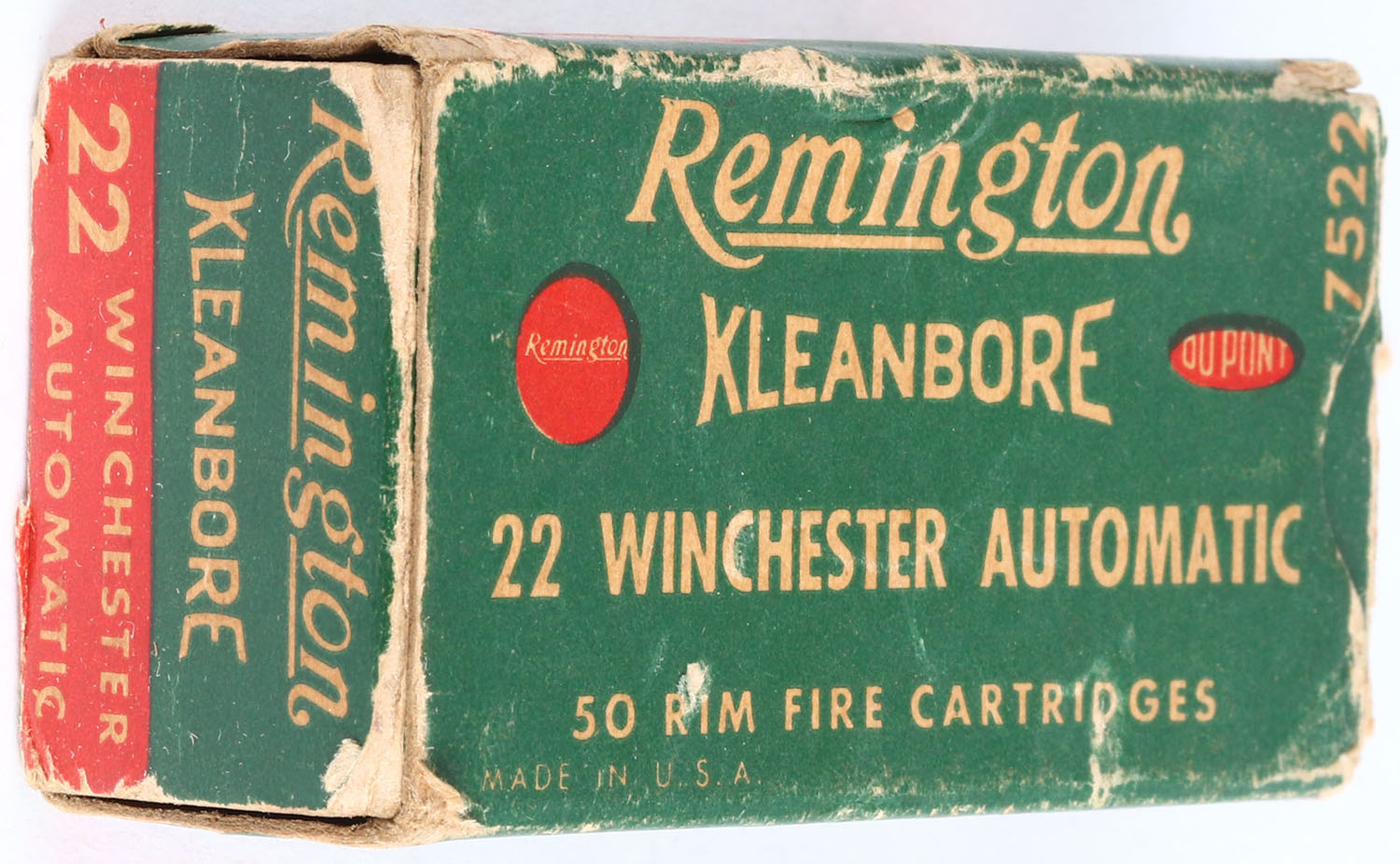 Remington, Kleanbore, .22 Winchester Automatic, RHWeb: REM-12 WA-1a, Full, 1pc. Green white & red box, box is solid with excellent color, very minor age soiling, some edge & corner wear, end flaps are fairly rigid, ammo is excellent. Grade: Excellent - Value: 10 to 50