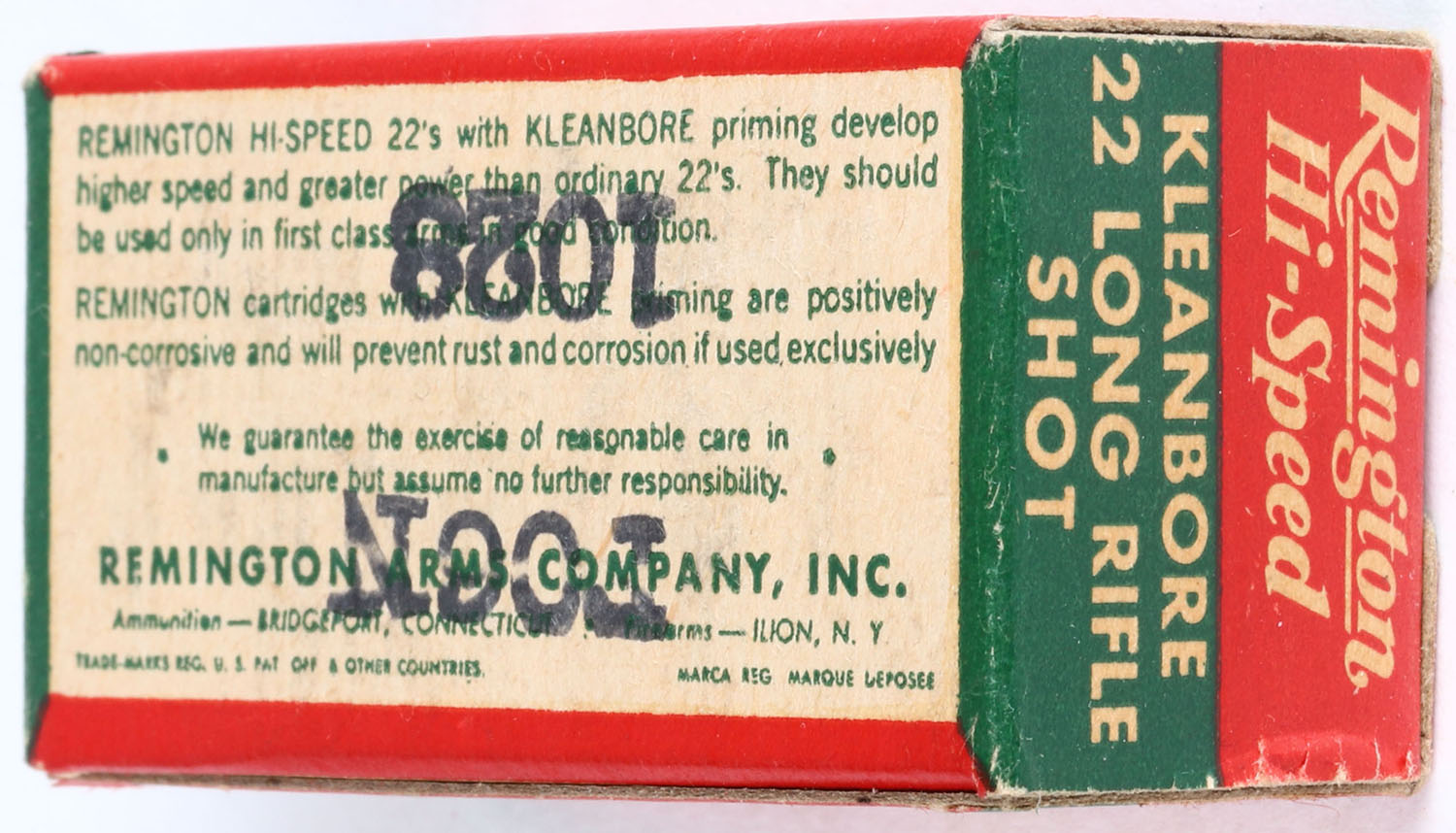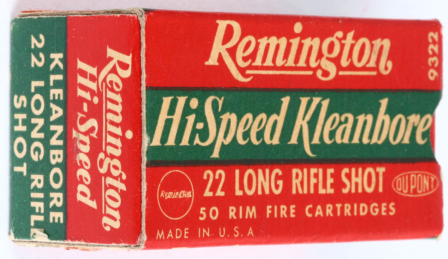 Remington, Hi-Speed Kleanbore, .22 Long Rifle Shot, REM-14 LR-5a, Full, 1pc. Red green & white box, box is solid with excellent color, minor age soiling & corner wear, edges are crisp, end flaps are solid, ammo is minty. Grade: Excellent ++ - Value: 20 to 60