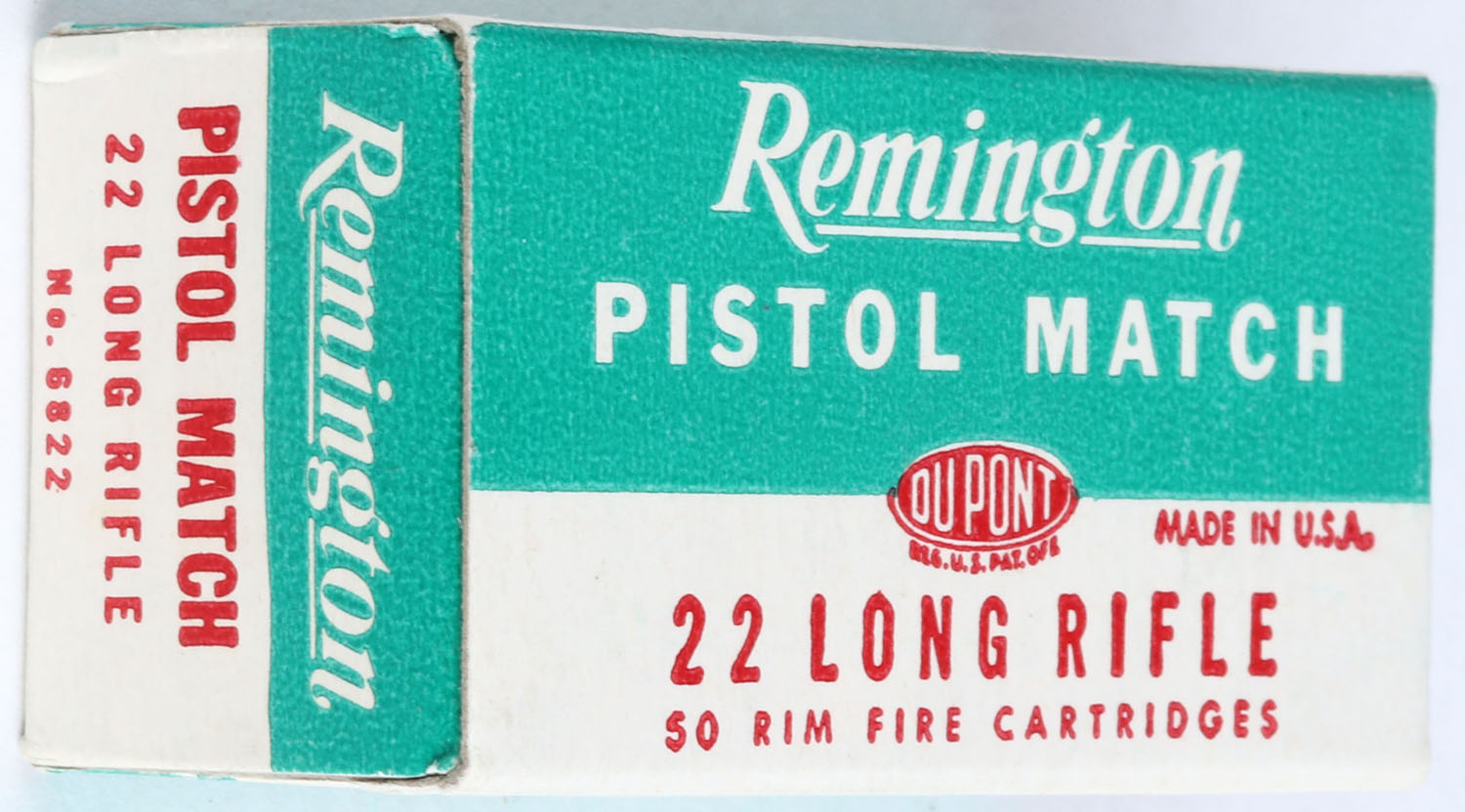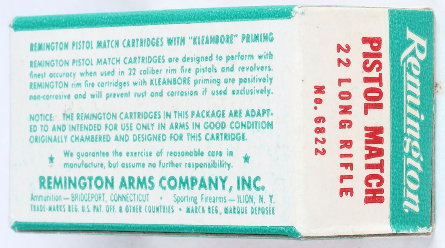 Remington, Pistol Match, .22 Long Rifle, Kleanbore, RHWeb: REM-54 LR-4c, Full, 1pc. Green white & red box, box is mint with minty color, corners are sharp, edges are crisp, end flaps are rigid, ammo is excellent to minty. Grade: Mint - Value: 10 to 50