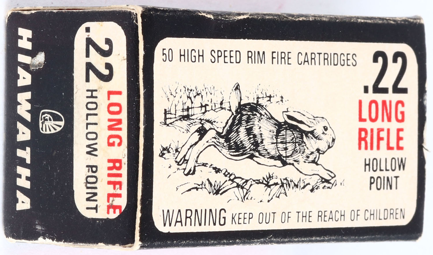 Gamble Stores, Hiawatha, .22 Long Rifle Hollow Point, RHWeb: GS-5 LR-2b, Full, 1pc. Black white & red rabbit box, box is solid with minty color, very minor edge & corner wear, end flaps are solid, ammo is minty. Grade: Excellent ++ - Value: 20 to 60