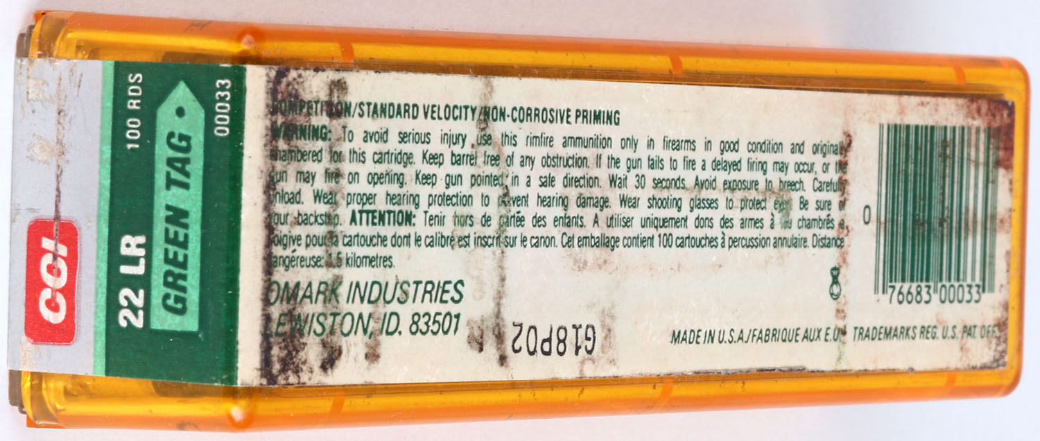 CCi, Green Tag Competition, .22 Long Rifle, RHWeb: CCI-6.1 LR-4f, FULL & SEALED, 2pc. Amber plastic tray with green silver & red label, box is solid, label has excellent color, some shelf wear, label is intact. Grade: Excellent + - Value: 10 to 40