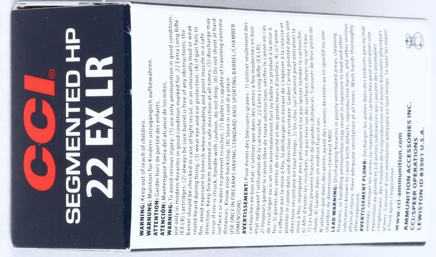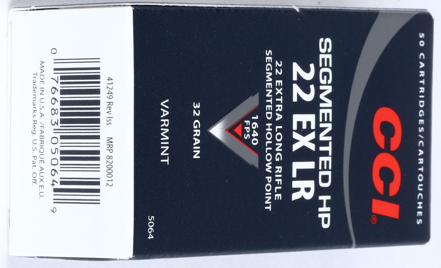 CCi, Varmint, .22 Extra Long Rifle, 32 Grain Segmented Hollow Point, 1640 FPS, Full, 1pc. Dark blue white & red box, box is MINT, with mint color, sharp corners, crisp edges, solid end flaps, ammo is mint. Grade: MINT - Value: 8 to 40
