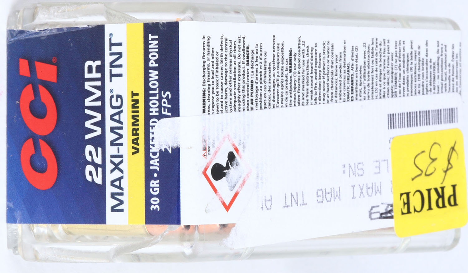 CCi, Maxi Mag TNT, .22 WMR, FULL & SEALED, 2pc. Clear plastic tray with blue sealing label, box is cracked, label is mint. Grade: Excellent - Value: 8 to 40