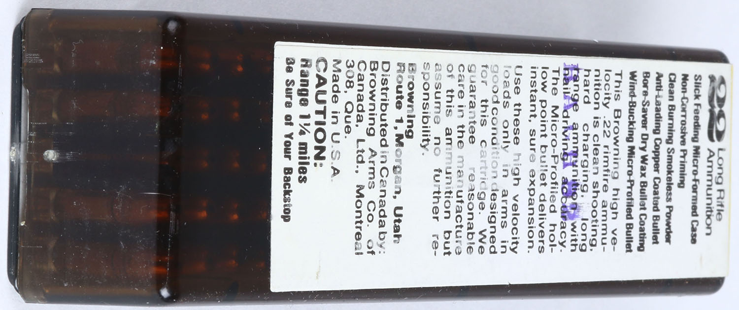 Browning, Nail Drivers, .22 Long Rifle Hollow Point, High Velocity, RHWeb: BROWN-2 LR-2, Full & Sealed, 2pc. Smoke colored plastic box with yellow & black label, box is solid, label has very good color with some color fading & shelf wear, ammo appears mint. Grade: Excellent - Value: 10 to 40