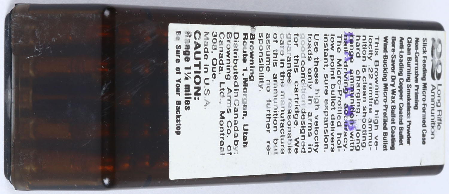 Browning, Nail Drivers, .22 Long Rifle Hollow Point, High Velocity, RHWeb: BROWN-2 LR-2, Full & Sealed, 2pc. Smoke colored plastic box with yellow & black label, box is solid, label has very good color with some color fading & shelf wear, ammo appears mint. Grade: Excellent - Value: 10 to 40