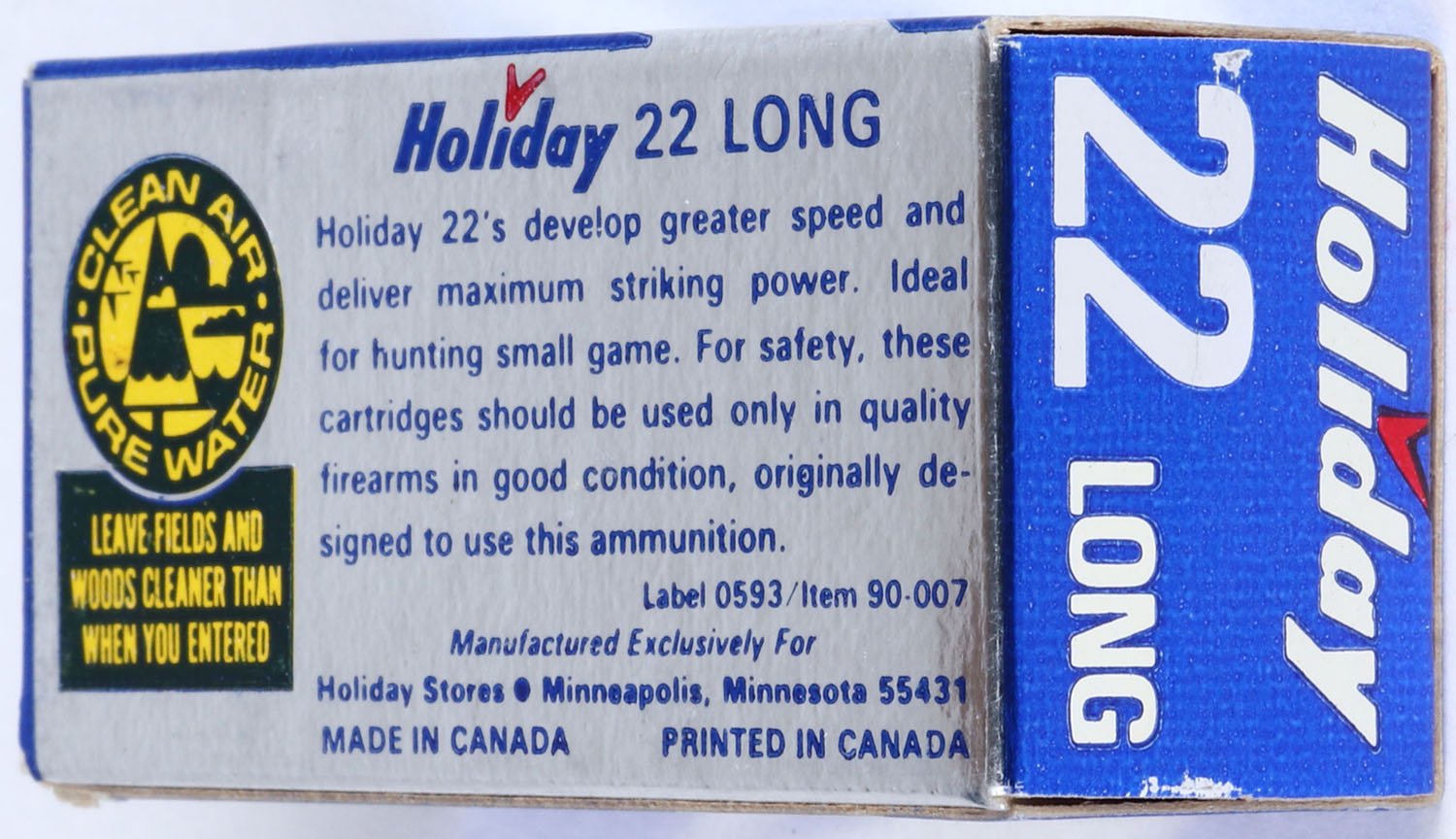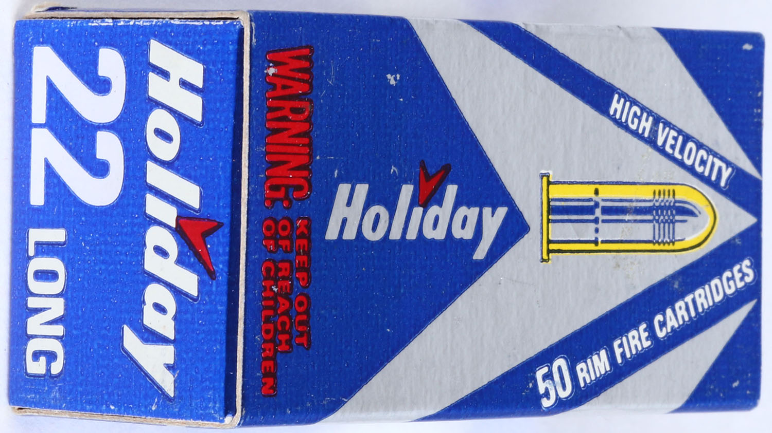 Holiday, .22 Long, High Velocity, RHWeb: HS-1 L-1, Full, 1pc. Blue silver & red box, box is solid with minty color, very minor shelf wear, corners are sharp, edges are crisp, end flaps are solid, ammo is excellent. Grade: Excellent ++ - Value: 20 to 40