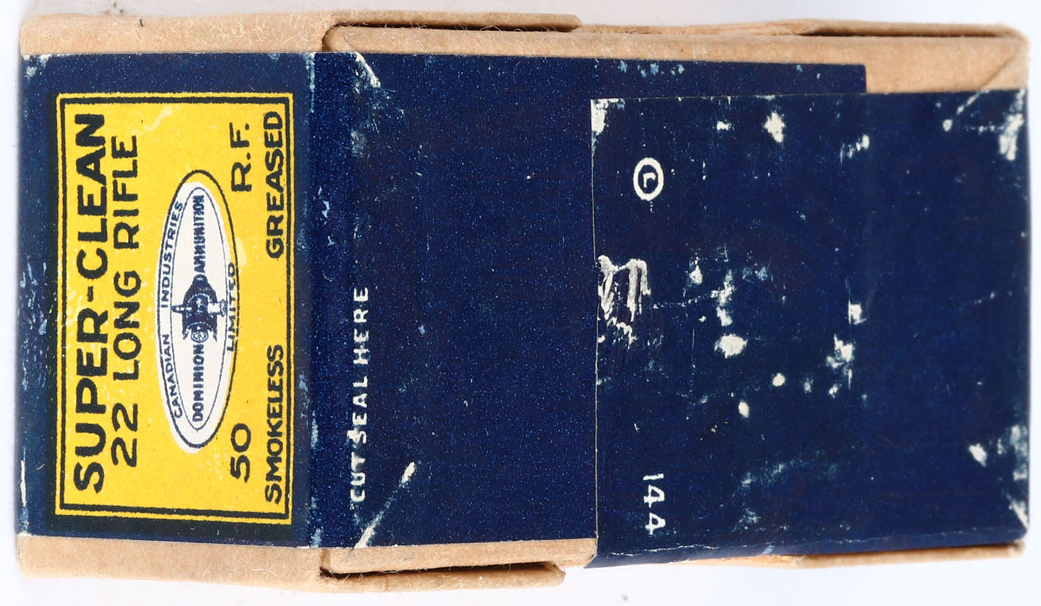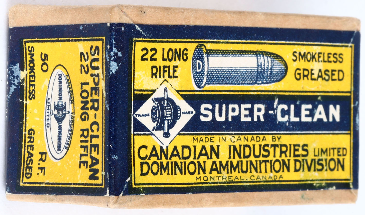 Dominion, Super-Clean, .22 Long Rifle, Smokeless Greased, RHWeb: D-3 LR-8, FULL & SEALED, 2pc. Buff box with yellow & blue wraparound label, box is near mint with minty color, only very minor shelf wear, corners are sharp, edges are crisp, label is intact. Grade: Excellent ++ - Value: 50 to 100