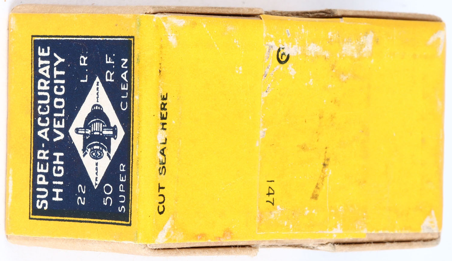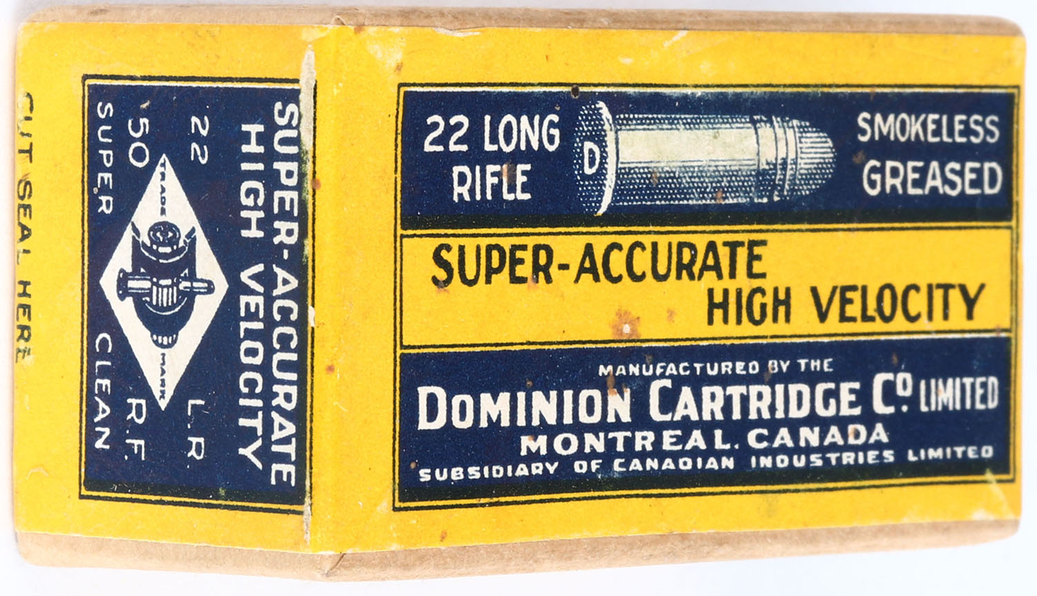 Dominion, Super-Accurate High Velocity, .22 Long Rifle, Smokeless Greased, RHWeb: D-4 LR-2, FULL & SEALED, 2pc. Buff box with yellow & blue wraparound label, box is solid with excellent color, only very minor age soiling, some shelf wear on bottom, corners are sharp, edges are crisp, label is intact. Grade: Excellent ++ - Value: 40 to 80
