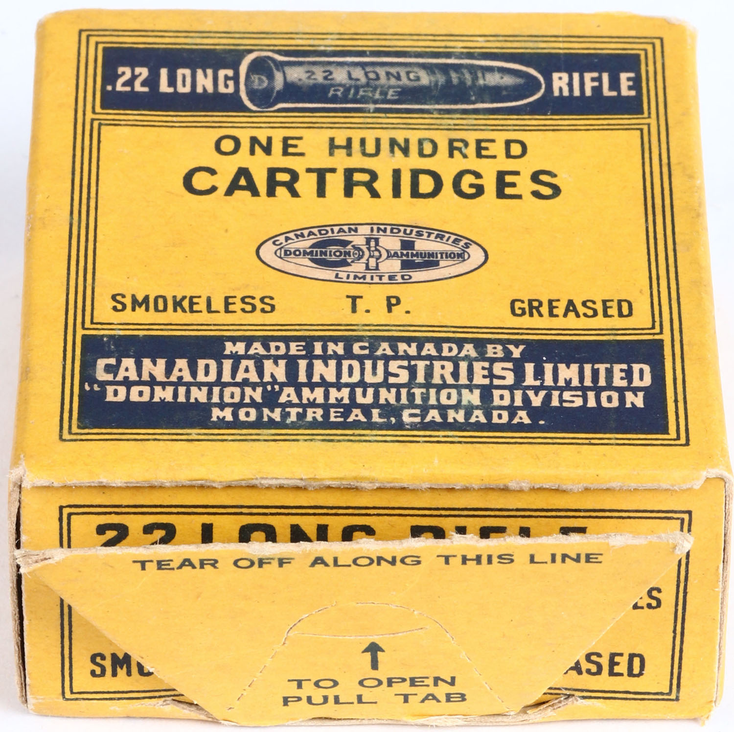 CIL, .22 Long Rifle, RHWeb: CIL-2 LR-9c, Full, 1pc. Yellow & blue box, box is solid with excellent color, very minor age soiling front flap is torn, edges are mostly crisp, back flap is solid, ammo is very good. Grade: Excellent - Value: 20 to 60