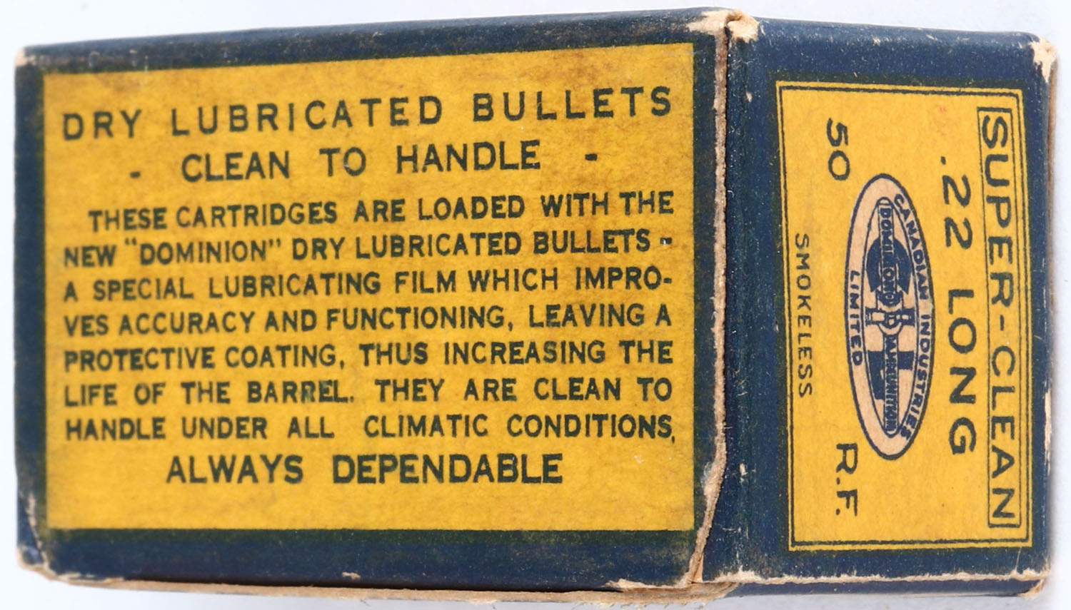CIL, Super-Clean, .22 Long, Smokeless, Dry Lubricated Bullets, RHWeb: CIL-2 L-2, Full, 1pc. Yellow & blue box, box is solid with very good to excellent color, some age soiling, minor edge & corner wear, top flap is solid, ammo is excellent to minty. Grade: Excellent + - Value: 10 to 40