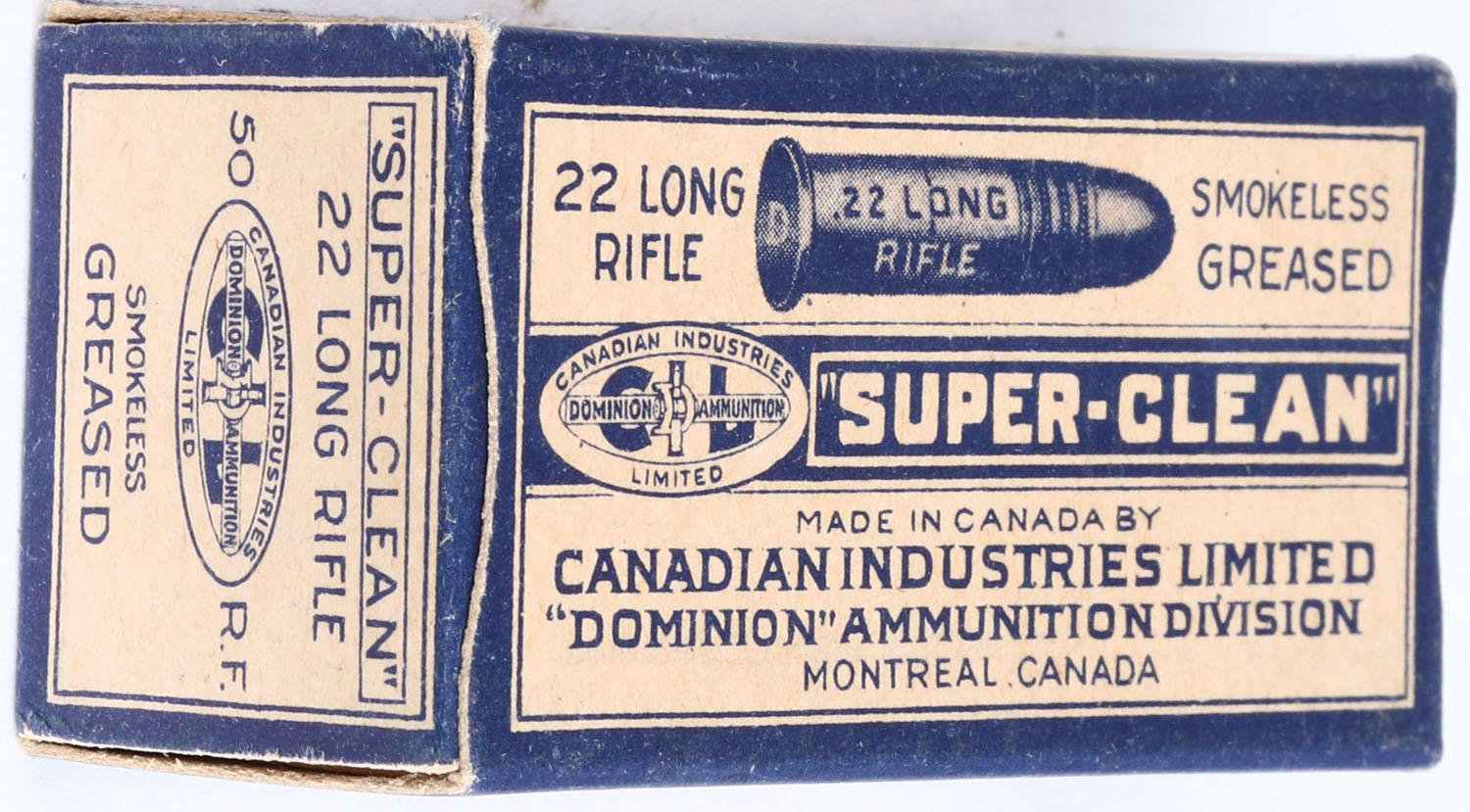 CIL, Super-Clean, .22 Long Rifle, Smokeless Greased, RHWeb: CIL-2 LR-3, Full, 1pc. Buff & blue box, box is near mint with minty color, only very minor shelf wear to bottom, very minor corner wear, edges are crisp, end flaps are solid, ammo is very good. Grade: Excellent ++ - Value: 10 to 40