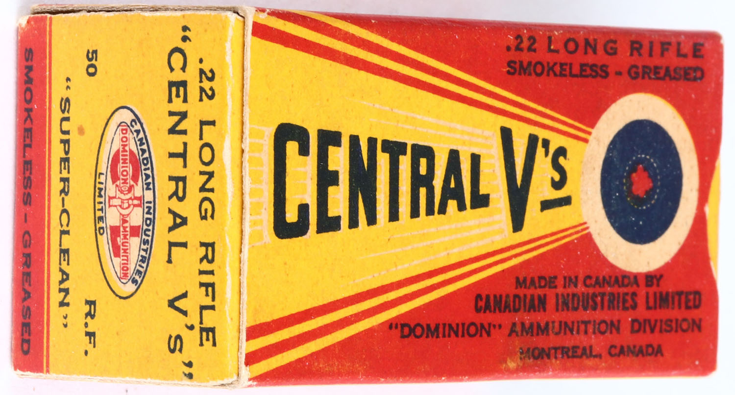 CIL, Central V's, .22 Long Rifle, Super-Clean, RHWeb: CIL-2 LR-14, Full, 1pc. Yellow & red box, box is solid with excellent color, only very minor age soiling, corners are sharp, edges are crisp, end flaps are rigid, ammo is very good. Grade: Excellent ++ - Value: 20 to 60