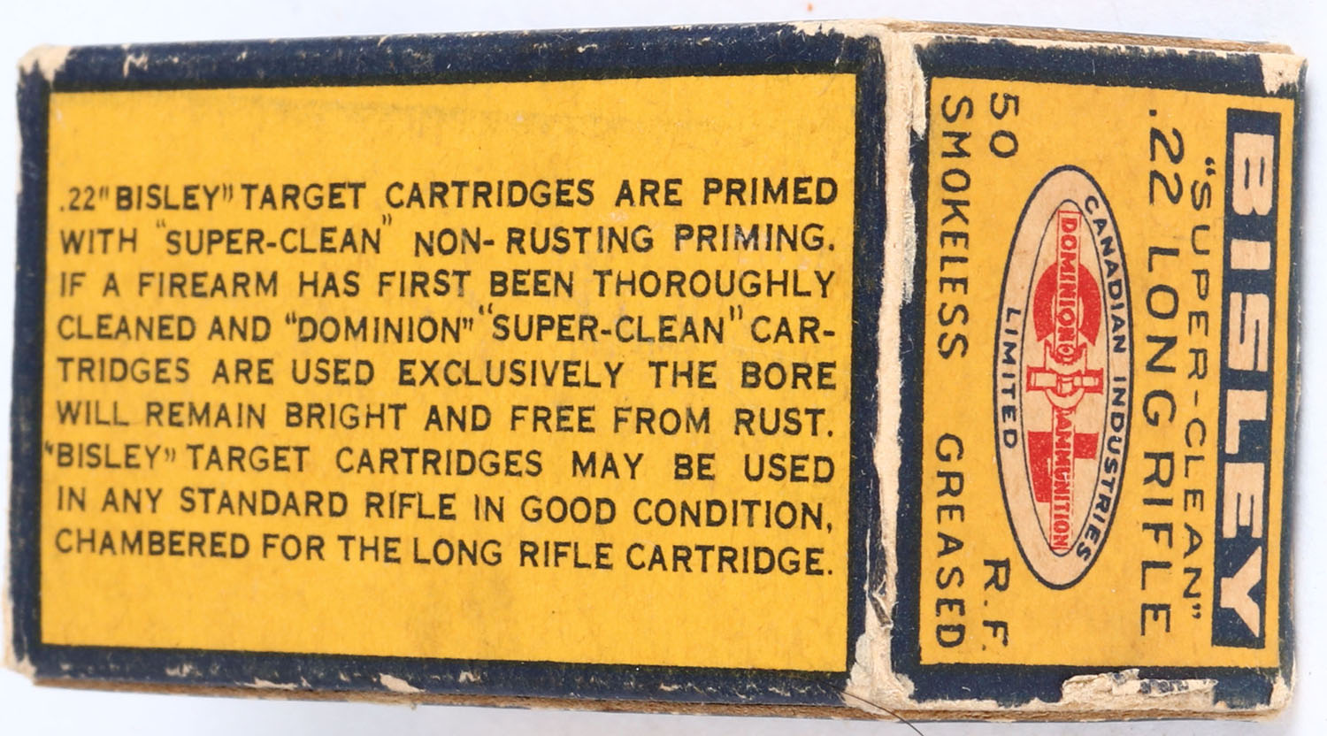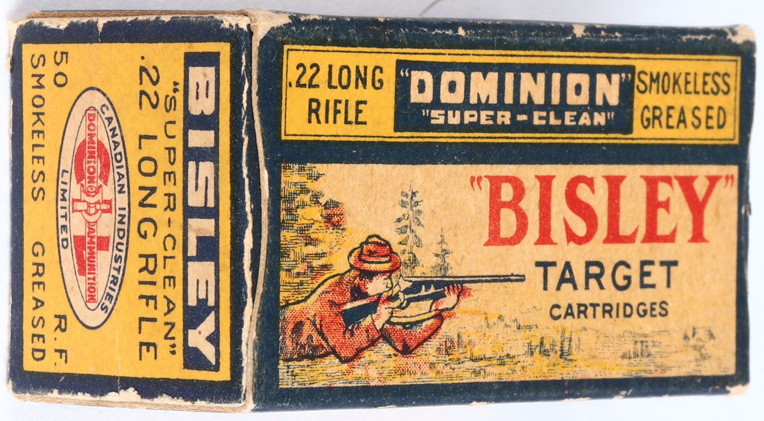 CIL, Bisley, .22 Long Rifle, Target, RHWeb: CIL-2 LR-15c, Full, 1pc. Multicolored box, box is solid with excellent color, minor corner & edge wear, very minor age soiling, end flaps are solid, ammo is excellent. Grade: Excellent + - Value: 100 to 250