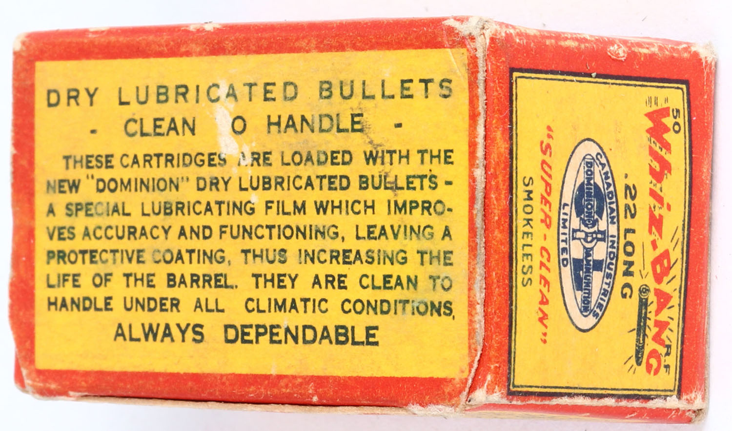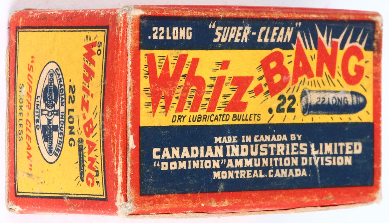 CIL, Whiz-Bang, .22 Long, Super-Clean, RHWeb: CIL-2 LR-6, Full, 1pc. Red yellow & blue box, box is solid with excellent color, very minor age soiling & corner wear, edges are mostly crisp, top flap is rigid, ammo is very good to excellent. Grade: Excellent ++ - Value: 20 to 60