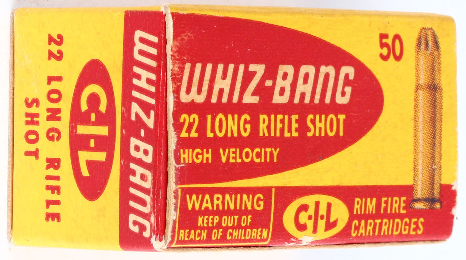 CIL, Whiz-Bang, .22 Long Rifle Shot, High Velocity, RHWeb: CIL-6 LR-4, Full, 1pc. Yellow & red box, box is solid with excellent to minty color, minor edge wear, corners are sharp, top flap is solid, ammo is minty. Grade: Excellent ++ - Value: 50 to 150