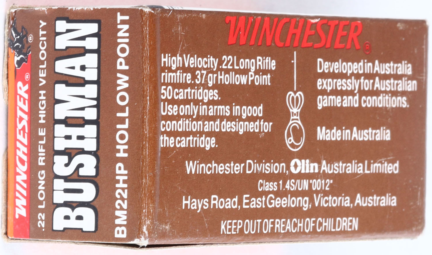 Winchester (Australia), Bushman, .22 Long Rifle Hollow Point, High Velocity, RHWeb: (Australia) BUSH-1 LR-2a, Full, 1pc. Brown & white box, box is near mint with minty color, only very minor shelf wear, corners are sharp, edges are crisp, end flaps are solid, ammo is excellent to minty. Grade: Excellent ++ - Value: 10 to 40
