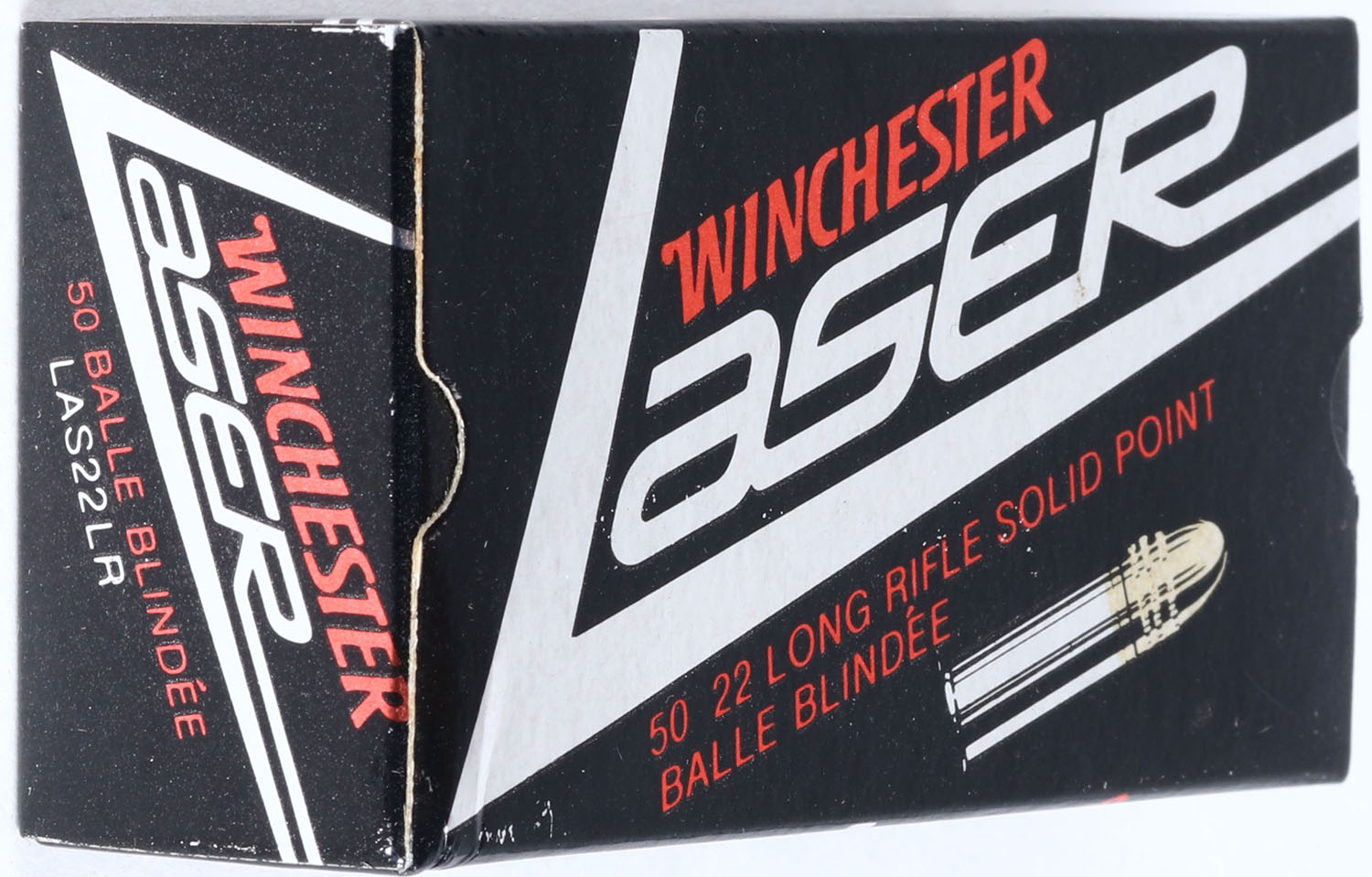 Winchester (Australia), Laser, .22 Long Rifle, Extra High Velocity, Solid Point, RHWeb: (Australia) LASER-1 LR-3a, Full, 1pc. Black silver & red box, box is solid with minty color, very minor shelf wear, one very minor corner ding on top front, corners are otherwise sharp, edges are crisp, end flaps are solid, ammo is minty. Grade: Excellent ++ - Value: 20 to 60