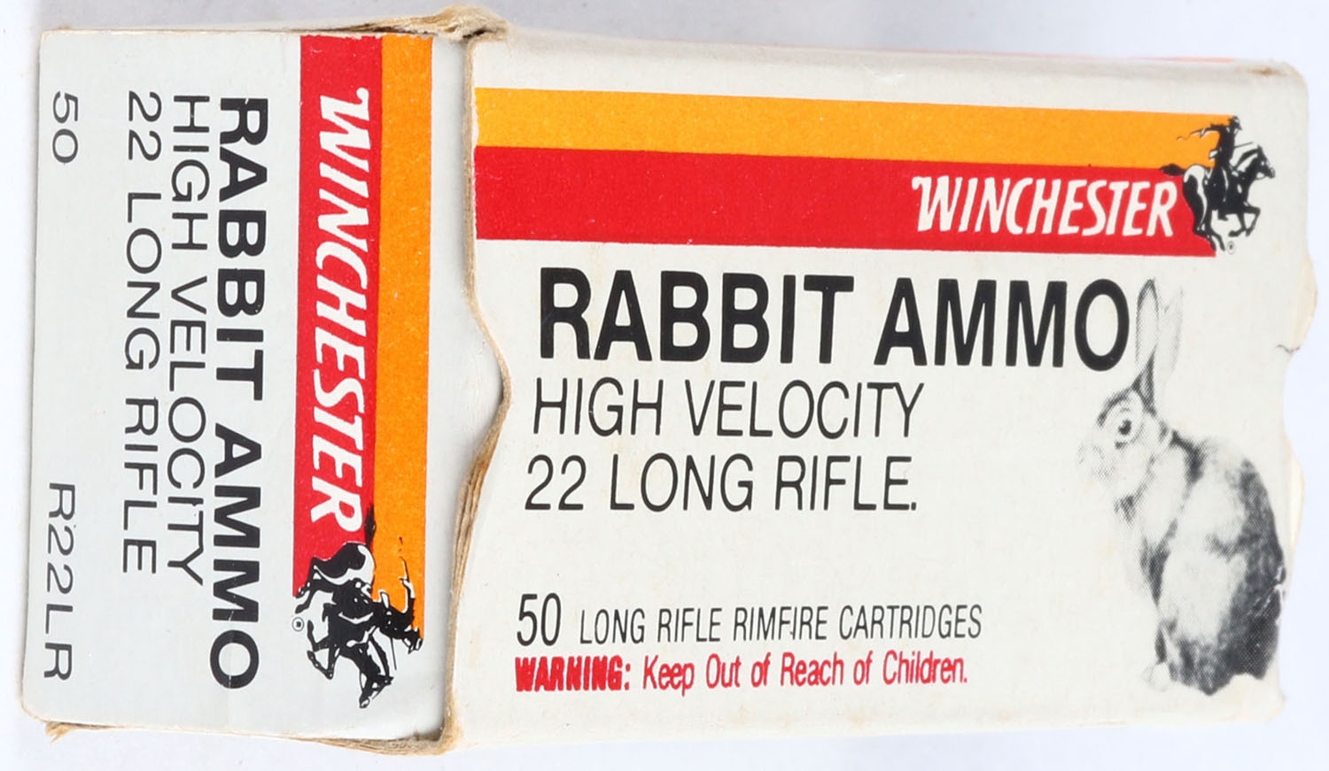 Winchester (Australia), Rabbit Ammo, .22 Long Rifle, High Velocity, RHWeb: (Australia) RABBIT-1 LR-4, Full, 1pc. White red & orange box with black printing, box is solid with excellent to minty color, very minor corner wear, edges are crisp, right end flap has much more wear than left end flap, both end flaps are connected and solid, ammo is minty. Grade: Excellent + - Value: 20 to 60