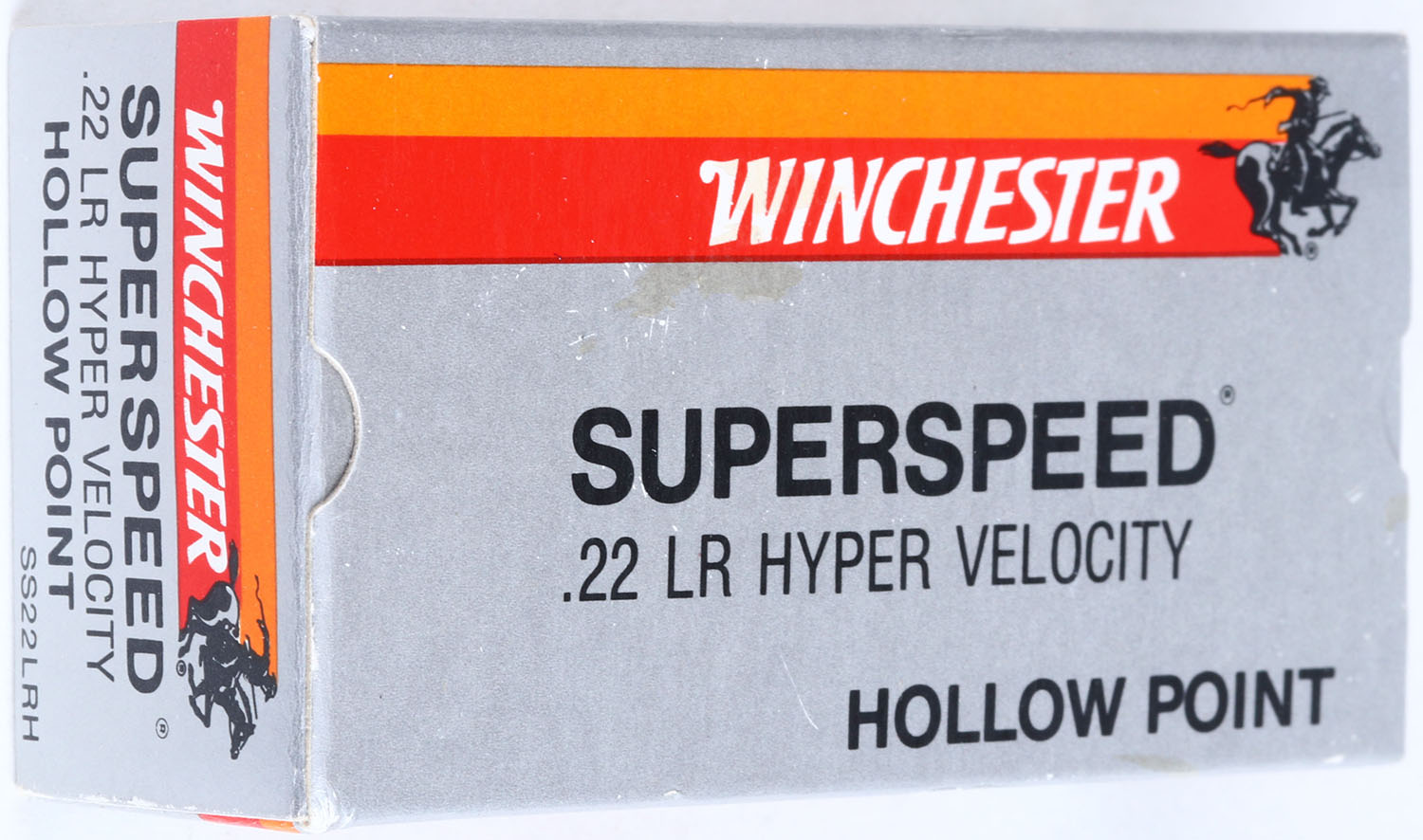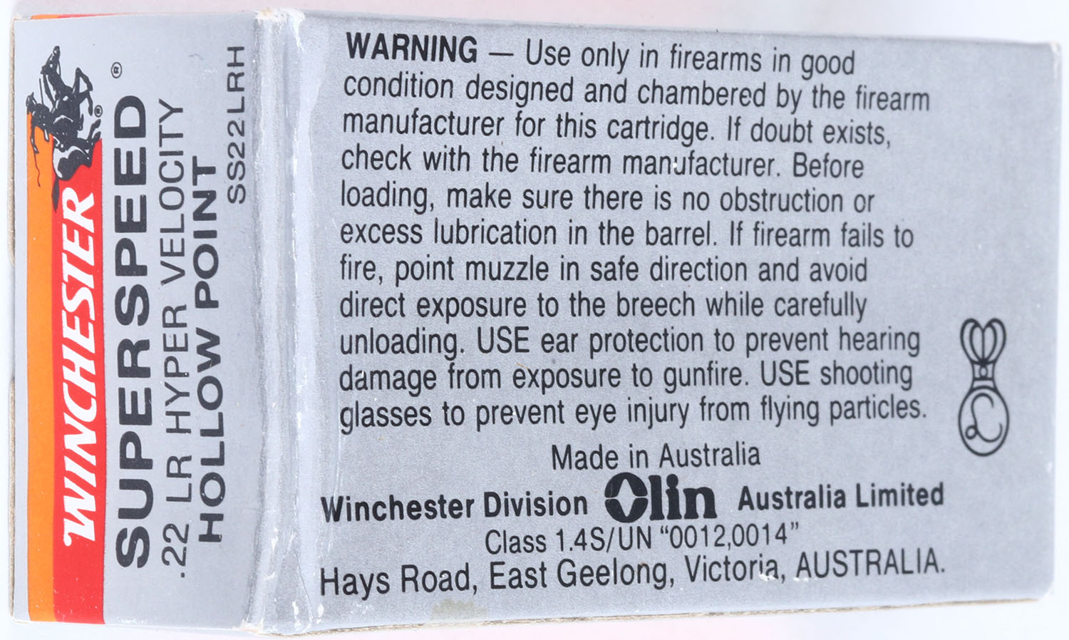 Winchester (Australia), SuperSpeed, .22 Long Rifle Hollow Point, Hyper Velocity, RHWeb: (Australia) SS-3 LR-9, Full, 1pc. Silver red & orange box with black printing, box is solid with excellent color, very minor shelf & corner wear, edges are mostly crisp, ding on bottom right edge, end flaps are solid, ammo is minty. Grade: Excellent + - Value: 10 to 50