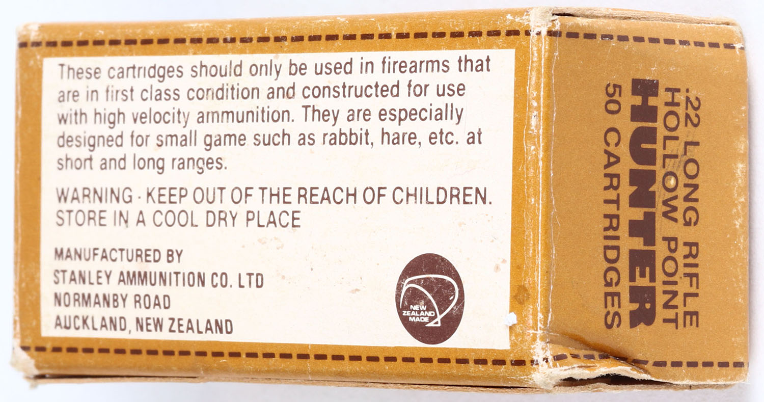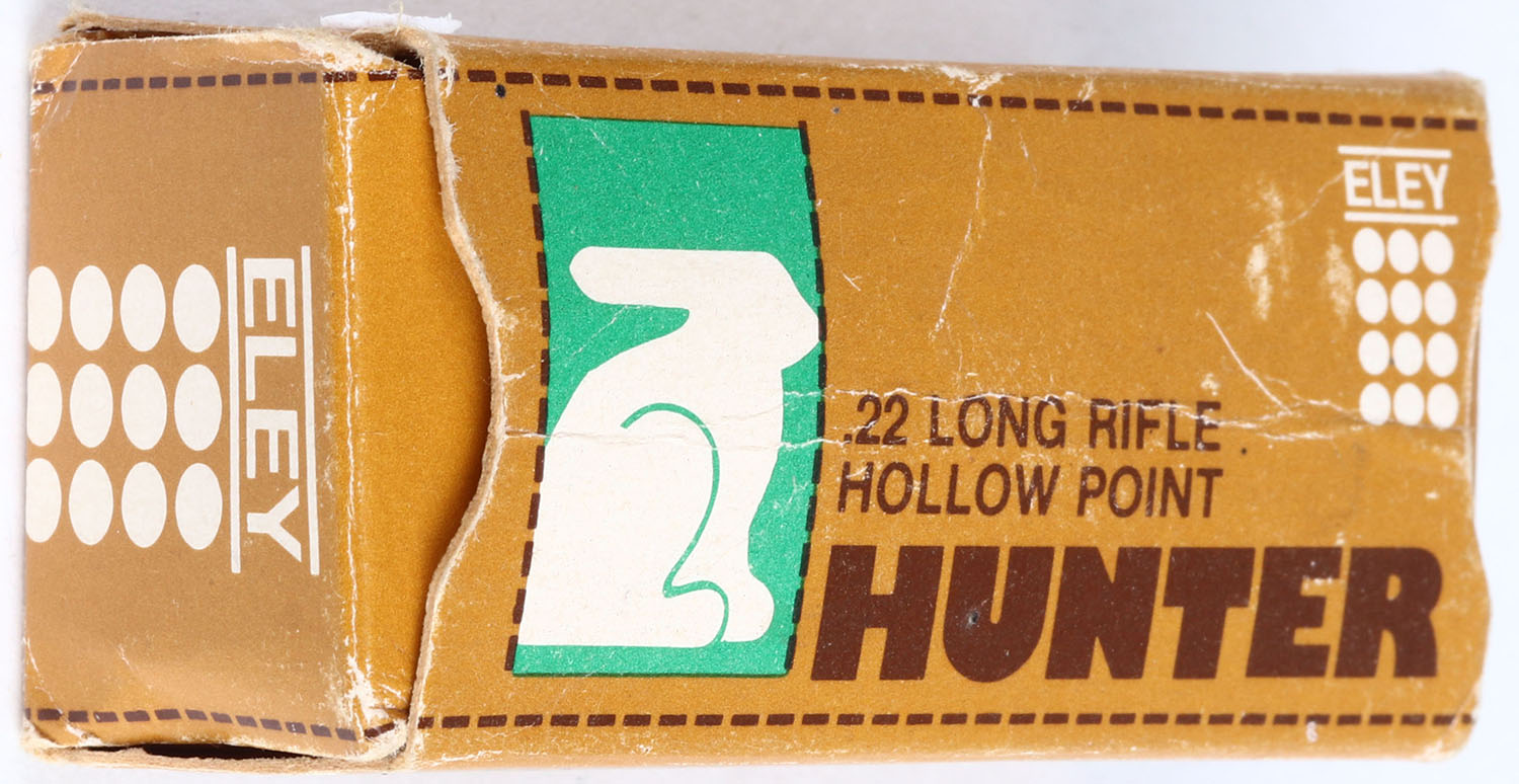 Eley (New Zealand), Hunter, .22 Long Rifle Hollow Point, RHWeb: (New Zealand) ELEY-1 LR-2. Full, 1pc. Brown green & white box, box is solid with excellent color, top has a minor crease from left to right, corner wear, very minor edge wear, end flaps are solid, ammo is minty. Grade: Excellent - Value: 6 to 30