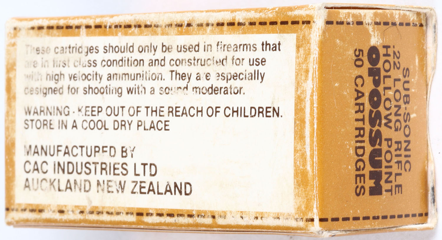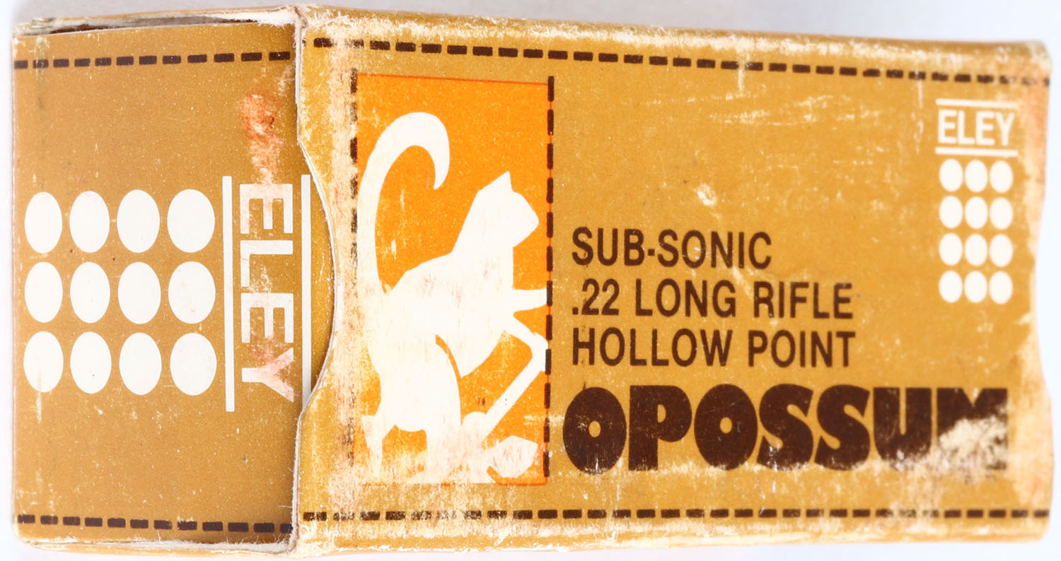 Eley (New Zealand), Opossum, .22 Long Rifle Hollow Point, Sub-Sonic, RHWeb: (New Zealand) ELEY-1 LR-3, Full, 1pc. Brown orange & white box, box is solid with excellent color, shelf wear, some edge & corner wear, end flaps are solid, ammo is minty. Grade: Excellent - Value: 6 to 30