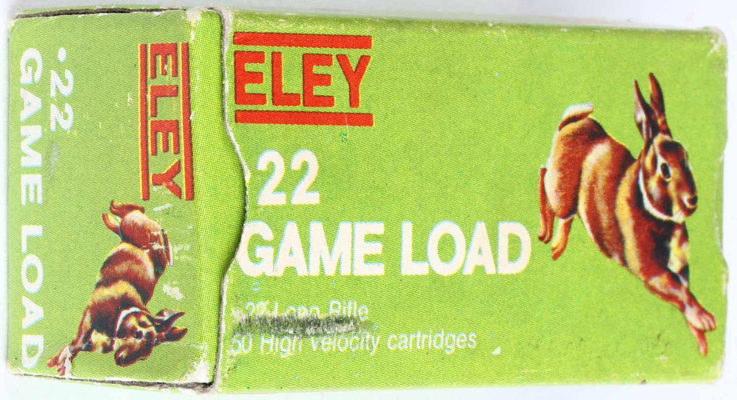 Eley (Philippines), 22 Game Load, .22 Long Rifle, High Velocity, RHWeb: (Philippines) ELEY-1 LR-5, Full, 1pc. Green red & white box, box is solid with excellent color, scuff on top, some shelf & corner wear, edges are crisp, end flaps are solid, ammo is excellent. Grade: Excellent + - Value: 6 to 30