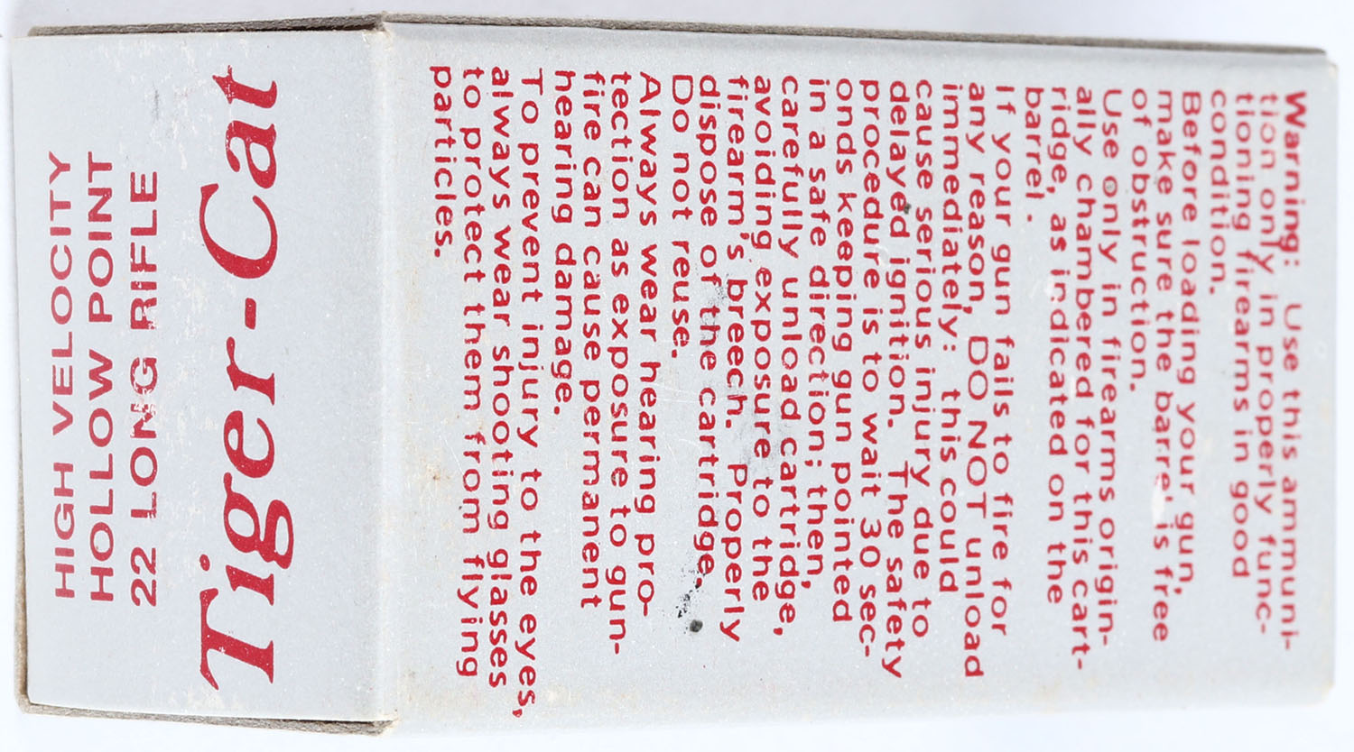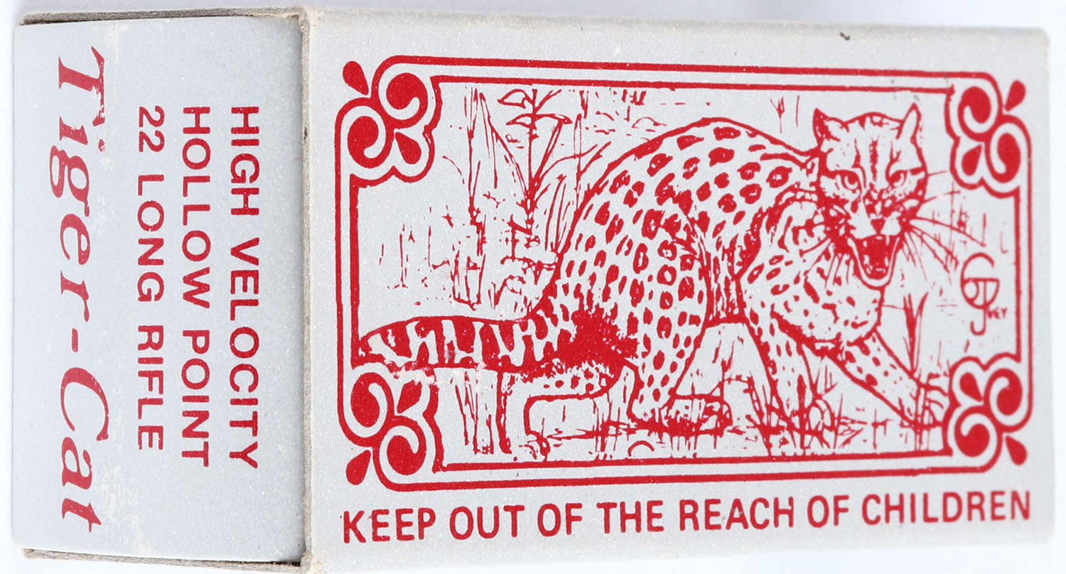 Southern Gun Distributors, Sovereign Tiger-Cat, .22 Long Rifle Hollow Point, RHWeb: SGD-1 LR-2, Full, 1pc. Gray and red box, box is MINT with minty color, corners are sharp, edges are crisp, end flaps are solid, ammo is mint. Grade: MINT - Value: 10 to 40