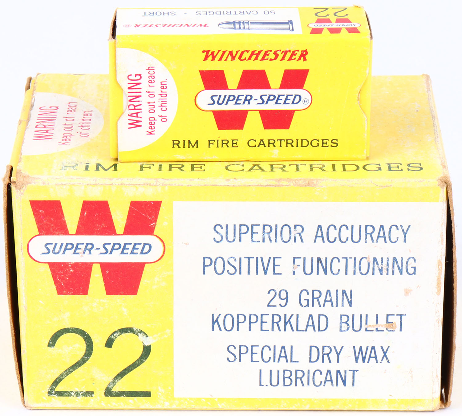Winchester, Super-Speed, .22 Short, Kopperklad Bullet, Full, 500rds. 1pc. Yellow white & red brick, brick is solid with good to very good color, color fading, some staining, shelf wear, some edge & corner wear, end flaps are solid, left end flap has been written on inside boxes are excellent. Grade: Excellent - Value: 40 to 120