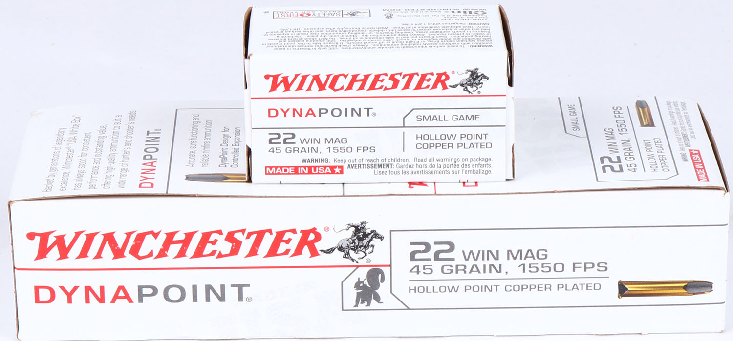 Winchester, DynaPoint, .22 Win. Mag., 45 Grain Copper Plated Hollow Point, 1550 FPS, Full, 250rds. 1pc. white & red brick with black printing, brick is MINT, corners are sharp, edges are crisp, top flap is solid, inside boxes are mint. Grade: MINT - Value: 50 to 70