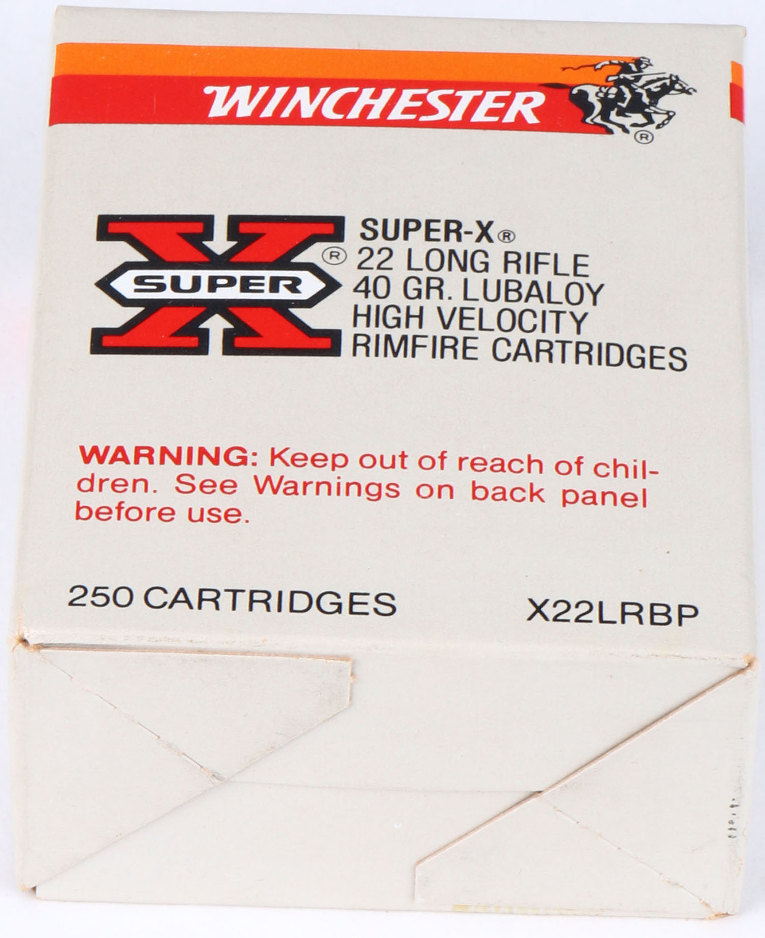 Winchester, Super-X, .22 Long Rifle, High Velocity, FULL & SEALED, 250rds. 1pc. Gray red & orange bulk box with black printing, box is solid with minty color, only very minor shelf wear, sticker on top, corners are mostly sharp, edges are crisp. Grade: Excellent ++ - Value: 20 to 60