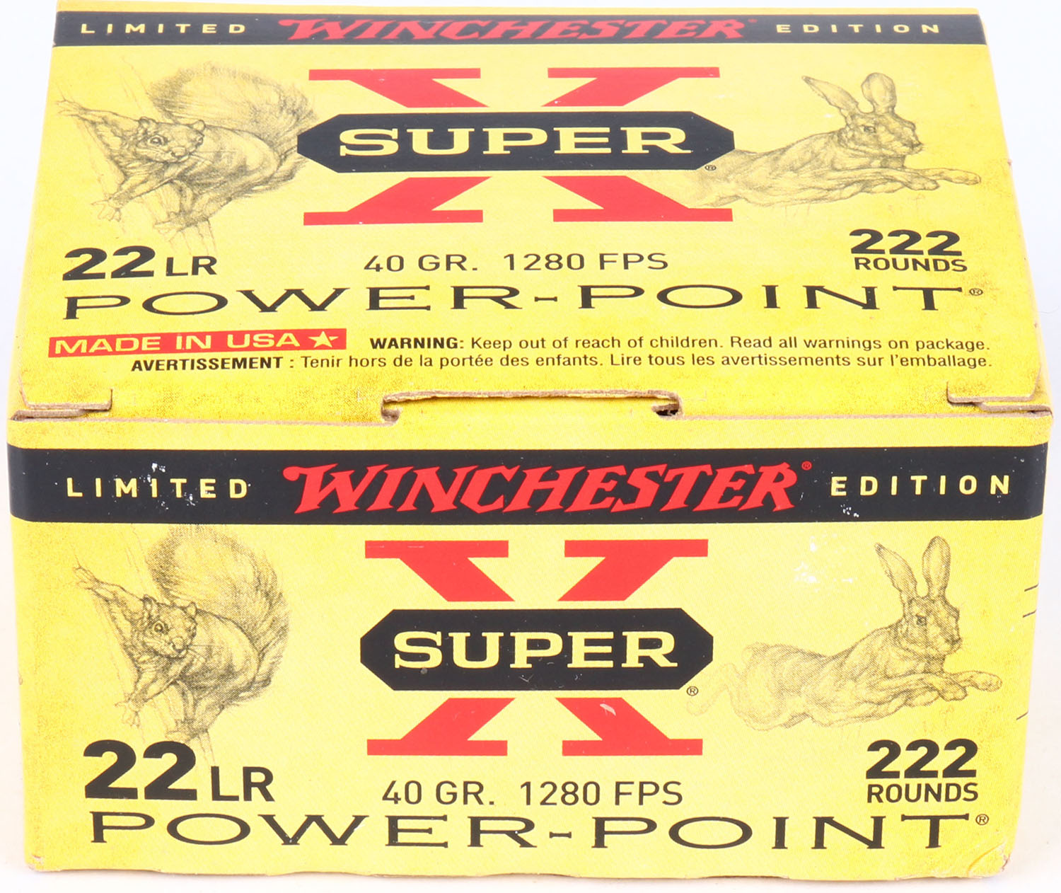 Winchester, Power-Point, .22 Long Rifle, Super X, 40 Grain, 1280 FPS, Full, 222 rds. 1pc. yellow black & red bulk box, box is solid with minty color, minor shelf wear, very minor corner ding on bottom front corner, corners are otherwise sharp, edges are crisp, top flap is solid, ammo is minty. Grade: Excellent + - Value: 20 to 40